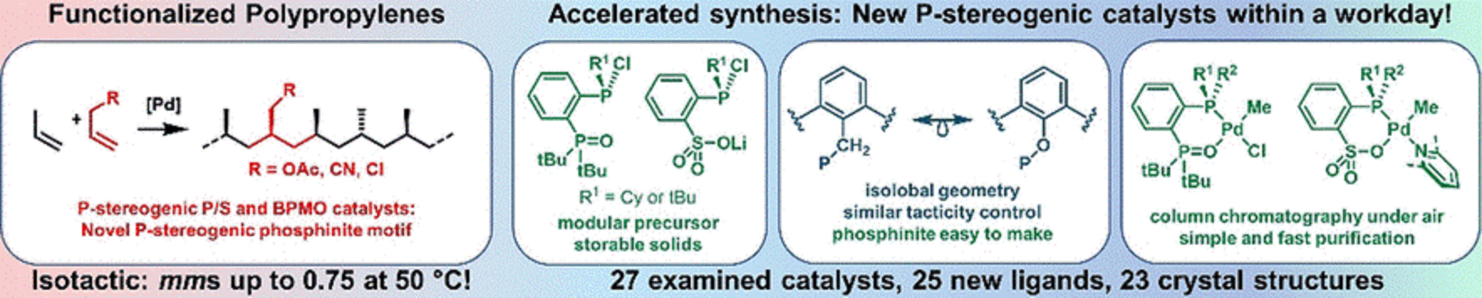 Mit den gängigen Ziegler-Natta- und Metallocen-Katalysatoren ist eine solche Copolymerisation jedoch stark eingeschränkt, da typische polare Monomere zuvor „maskiert“, d.h. mit speziellen Schutzgruppen bestückt werden müssen. Mit Nickel- oder Palladium-Katalysatoren geht es auch unmaskiert – allerdings unter deutlichen Einbußen bei der Isotaktizität. Gewisse Erfolge konnten mit speziellen Ni- und Pd-Phosphin-Komplexen (ein Typ Phosphor-haltiger organischer Verbindung) erzielt werden, deren Synthese sich jedoch ausgesprochen mühsam und zeitaufwendig gestaltet.