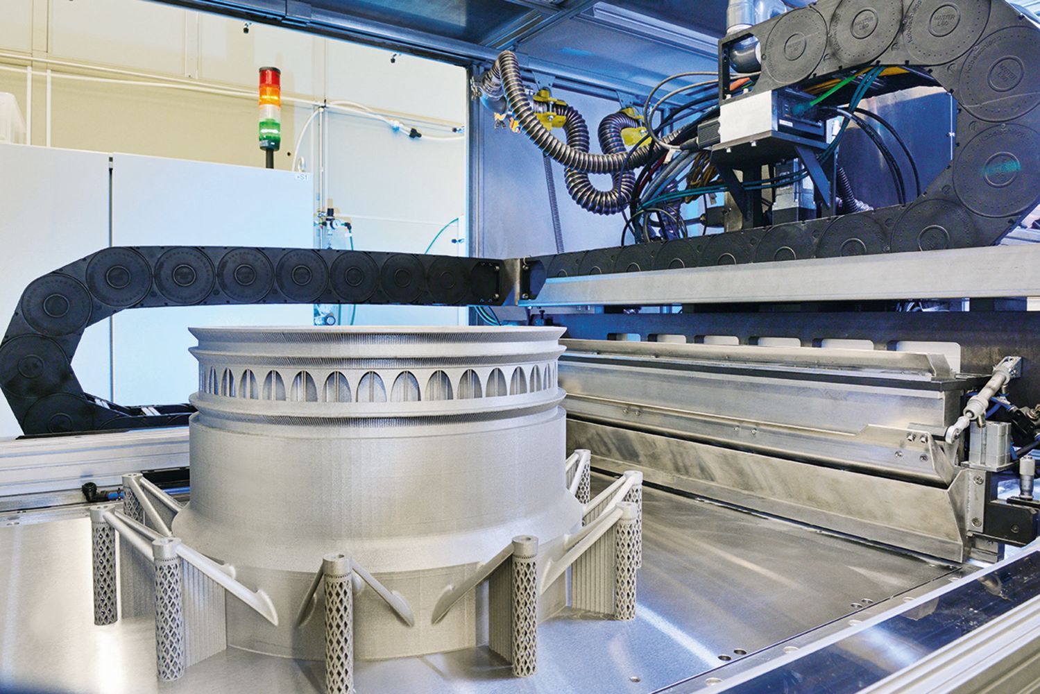 Die Wissenschaftler vom Fraunhofer ILT aus Aachen entwickelten ein Demonstrator-System, das ein Maschinenhersteller gebaut hat. Es ist eine Anlage zum 3D-Druck von Bauteilen im XXL-Maßstab: Per Laser Powder Bed Fusion (LPBF) entstand dank des großen Bauraums (1000 mm x 800 mm x 400 mm) ein Demonstrator-Bauteil für zukünftige Triebwerksgenerationen von Rolls-Royce. Möglich wird dies durch ein neues Maschinensystem mit mobilem Optiksystem. Ähnliche Erfolge gab es auch beim Extremen Hochgeschwindigkeits-Laserauftragschweißen (EHLA), mit dem sich nun auch 3D-Bauteile herstellen lassen. Der neu entwickelte Prozess erlaubt extreme Auftragsgeschwindigkeiten bei gleichzeitig hoher Detailauflösung.
