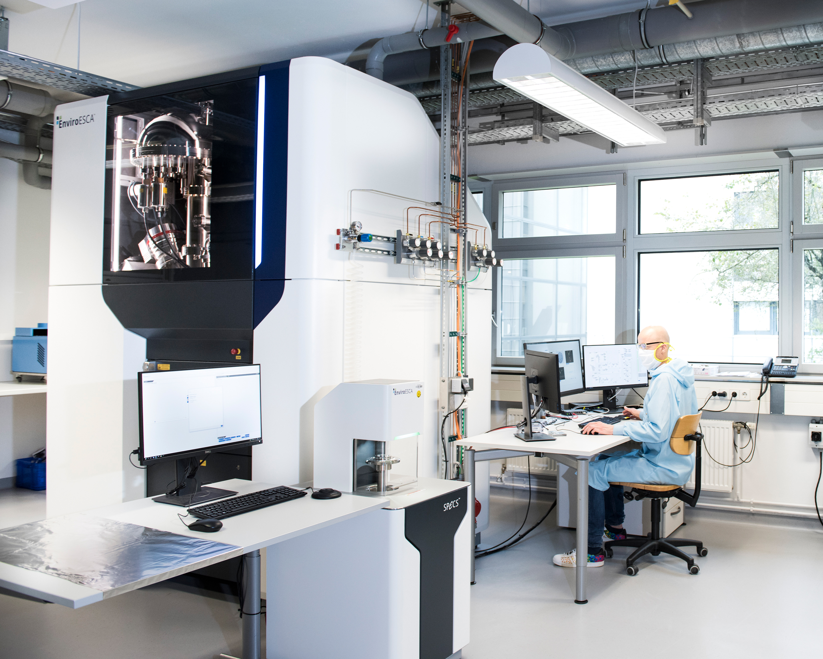 The new NAP-XPS system is unique within the Fraunhofer-Gesellschaft and offers a broader spectrum of scientific characterization with state-of-the-art analytic technology to partners from the chemical and process industries, among others.. With this system the chemical states of almost all surfaces under near-ambient pressure conditions can be investigated. The focus is on the interactions between gases or liquids with material surfaces, for example, gas molecules with catalytic surfaces and material degradation during long-term tests. Innovative is that materials can be investigated not only under ultra-high vacuum conditions (~10-8 mbar) as in conventional XPS, but also under reaction conditions with up to 25 mbar pressure and a temperature range from 5 °C up to 1,000 °C. This enables in-situ analysis of surface changes due to interaction with gases that influence the composition or oxidation state for various material classes in the fields of material science, microelectronics, the food and pharmaceutical industry, archeology and many other research fields.