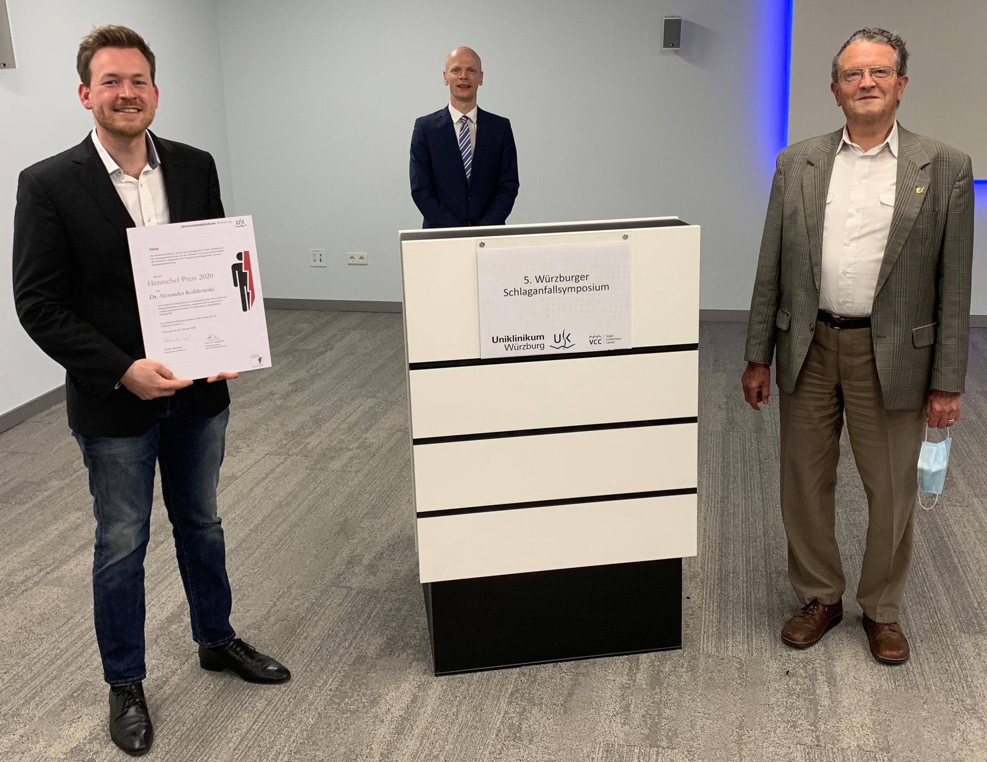 In diesem Jahr überreichte Dipl.-Ing. Günter Hentschel, der Gründer der Stiftung, den bundesweit ausgeschriebenen und mit 5.000 Euro dotierten Preis an Dr. Alexander Kollikowski vom Institut für Diagnostische und Interventionelle Neuroradiologie des UKW (Direktor: Prof. Dr. Mirko Pham) für seine Arbeit „Lokale Leukozyten-Invasion während des humanen hyperakuten ischämischen Schlaganfalls“, die unlängst im Fachblatt Annals of Neurology publiziert wurde.