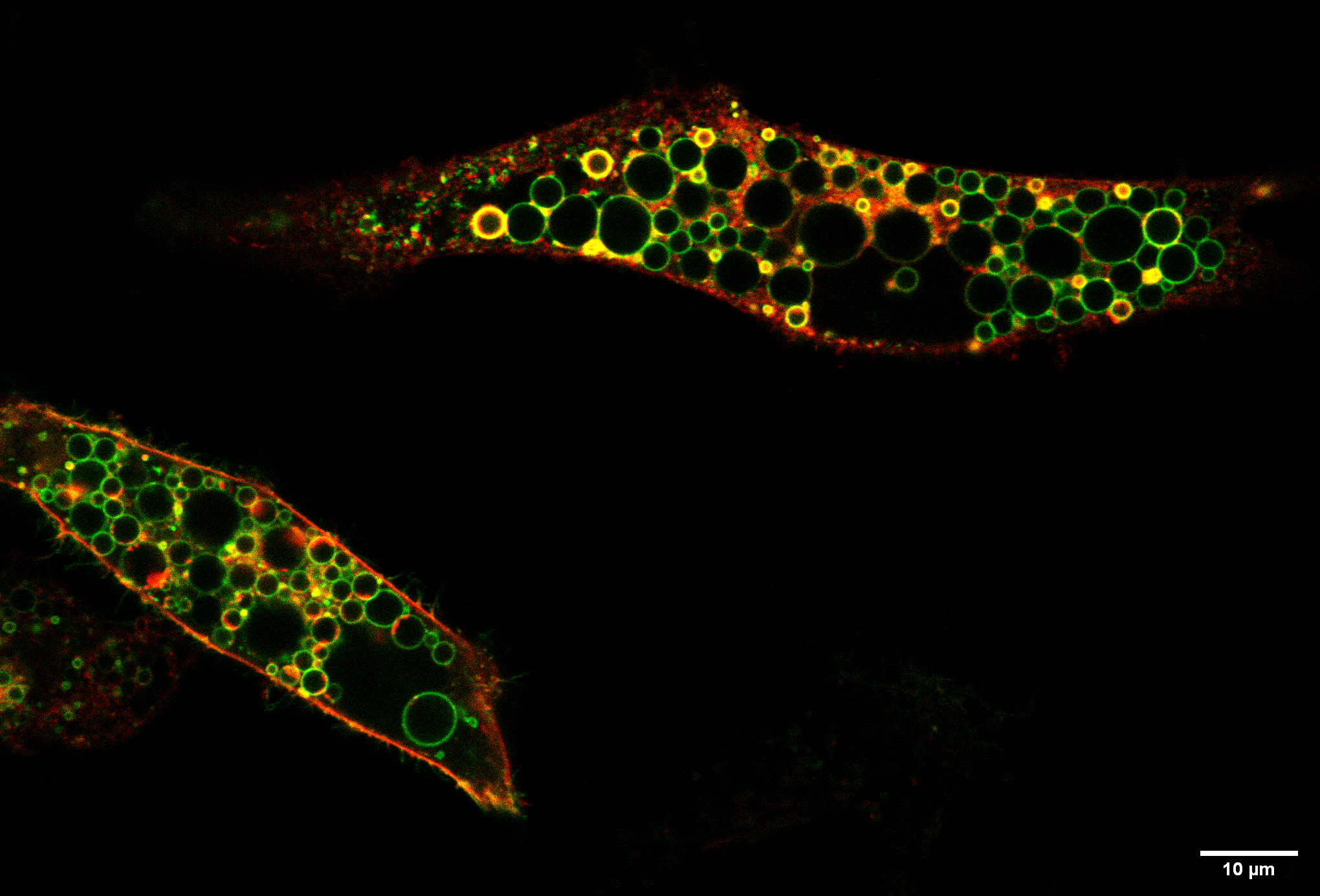 Mikroskopische Aufnahme zweier Zellen, die die krankheitserzeugende Mutante von ClC-6 (rot markiert) überproduzieren. Dies führt zur Entstehung großer Vesikel, die den lysosomalen Marker LAMP-1 in der Membran tragen. Vesikel mit hohem Membrangehalt an ClC-6 und LAMP-1 erscheinen in der Überlagerung als gelb. Bild: Carlo Barbini