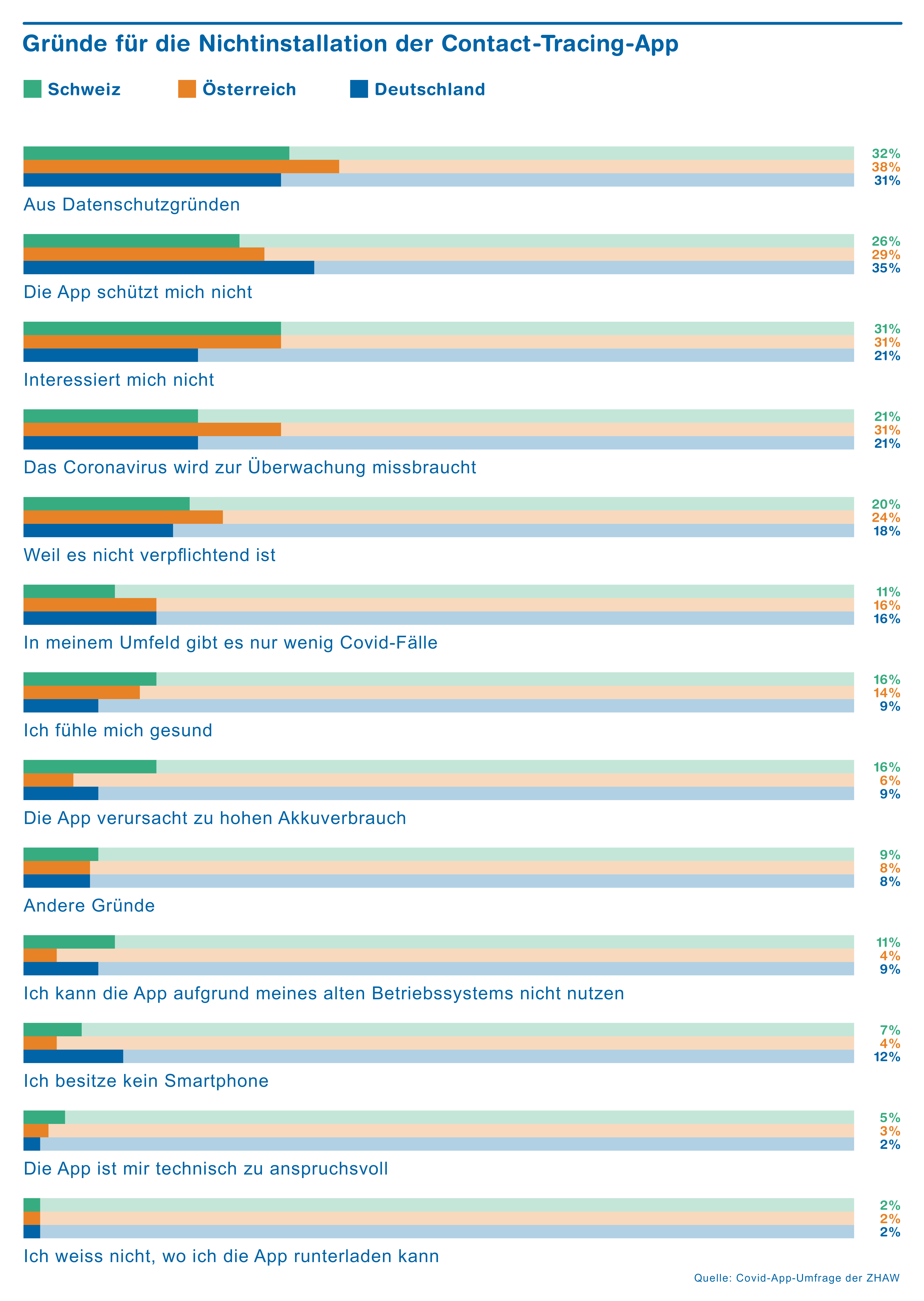 Wer die App nicht installiert, äussert in Österreich wie auch der Schweiz am häufigsten Bedenken bezüglich des Datenschutzes (CH: 32 Prozent, DE: 31 Prozent, A: 38 Prozent). Mindestens ein Fünftel der Personen, die keine App installieren, hat Angst, dass die Pandemie zur Überwachung der Bevölkerung missbraucht wird (CH: 21 Prozent). Weitere Gründe für die Nichtinstallation der App sind: fehlendes Interesse (CH: 31 Prozent); die App bietet keinen Schutz (CH: 26 Prozent); die Leute fühlen sich gesund und ihr Umfeld ist nicht betroffen (CH: 11 Prozent).