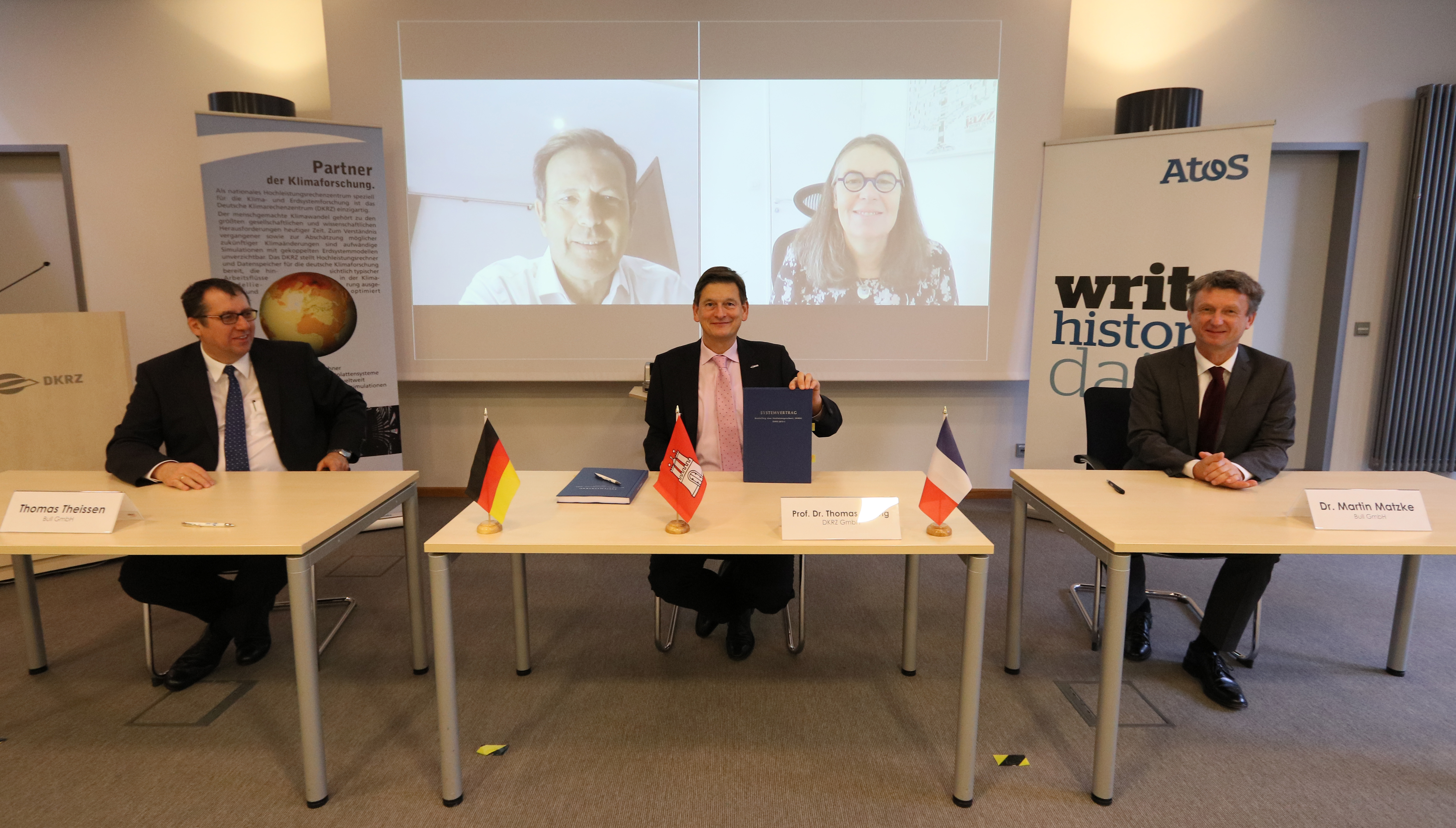 The contract has been signed for Atos by Dr. Martin Matzke, Director Big Data und Security for Atos Central Europe, and Thomas Theissen, Director MCS for Atos in Germany, as well as for the DKRZ by its director Prof. Thomas Ludwig. Atos was further represented by Thomas Weselowski, Director Extreme Computing, Big Data and Security, and - connected via video conference - by Agnès Boudot, Senior Vice President HPC & Quantum, and Philippe Miltin, Senior Vice President Global Head of Sales Big Data Security.