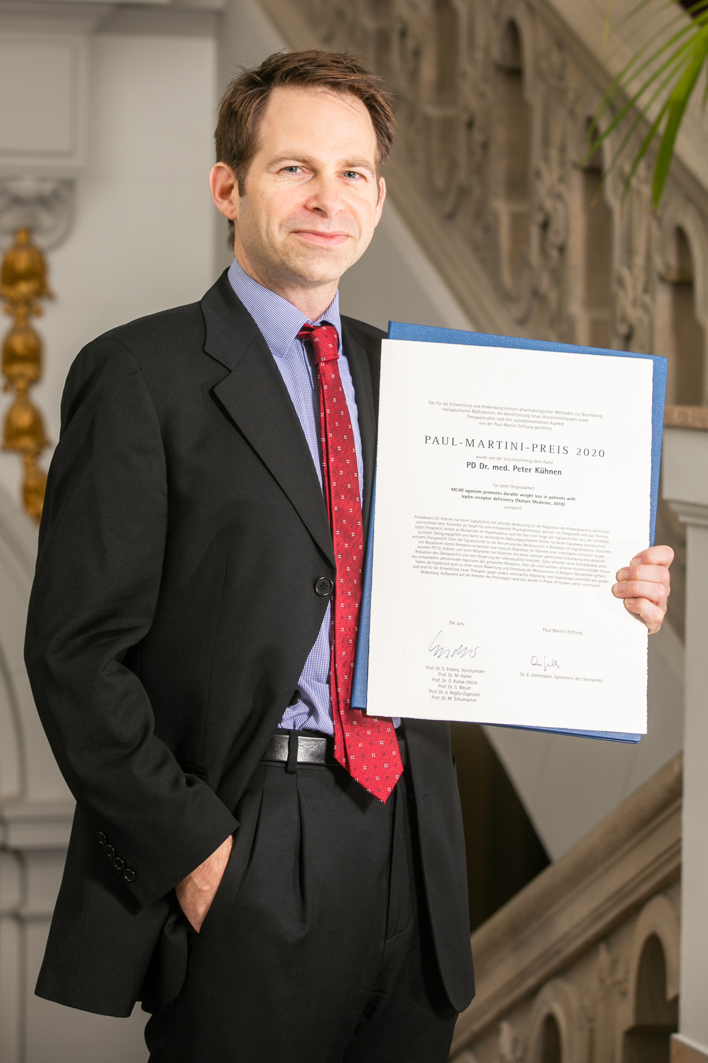 Am 20.11.2020 hat Prof. Dr. med. Peter Kühnen vom Institut für Experimentelle Pädiatrische Endokrinologie an der Charité – Universitätsmedizin Berlin den diesjährigen Paul-Martini-Preis für Studien zur Normalisierung des Körpergewichts bei erblich bedingt Übergewichtigen erhalten. Der Preis wird jährlich von der Paul-Martini-Stiftung, Berlin, für herausragende Leistungen in der klinisch-therapeutischen Arzneimittelforschung verliehen. Er ist mit 50.000 Euro dotiert.