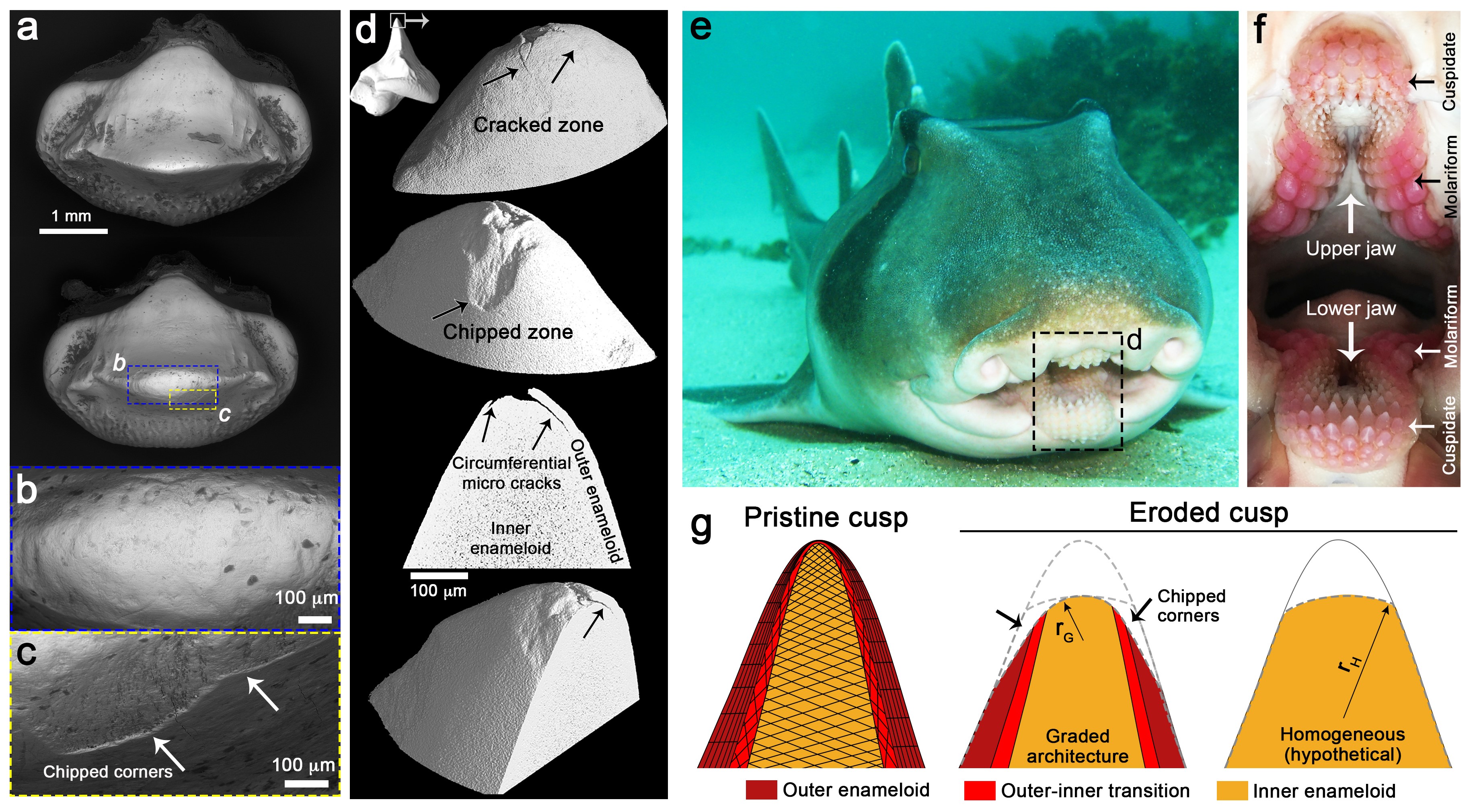 Shark teeth must function to the point during their short retention time: The Port Jackson shark feeds on hard-shelled prey such as sea urchins, starfish, mussels and snails. Its teeth must be able to withstand high mechanical stress. The special structure of the tooth enamel ensures this continuously high performance: "The special feature is that the inner layer of tooth enameloid provides mechanical stability, while the outer one splinters off successively. This allows the tooth to retain its function," says Dr. Shahrouz Amini. This insight provides new design paradigms for functionalized materials with exterior coatings that can be damaged and replaced, without limiting the performance.