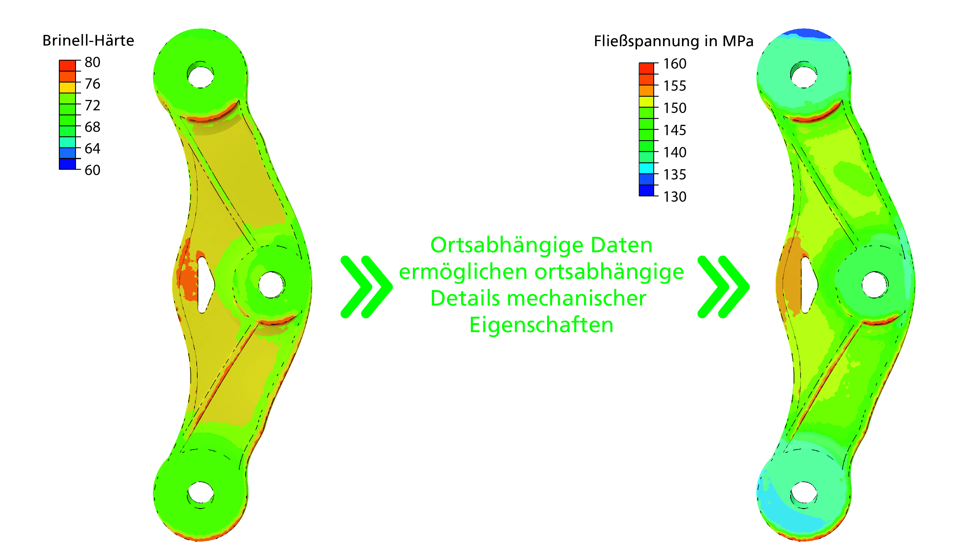 Den Nachweis, dass diese strukturierte und übergreifend verknüpfte Wissensbasis echten Mehrwert bringt, erbrachten Schweizer und Co durch die Integration von experimentellen Daten und Simulationen. Für ein Gussteil erzeugten sie so einen digitalen Zwilling, der den Zusammenhang der örtlich unterschiedlichen Erstarrung beim Gießen und der örtlich variierenden Härte ausnutzt, um ein Simulationsmodell mit heterogen verteilten mechanischen Eigenschaften aufzubauen. Über Erkenntnisse aus dem Datenraum kann das Simulationsmodell zusätzlich mit präzise gewählten Werkstoffparametern gefüttert werden, die die gussteilspezifische chemische Zusammensetzung und Wärmebehandlung berücksichtigen.