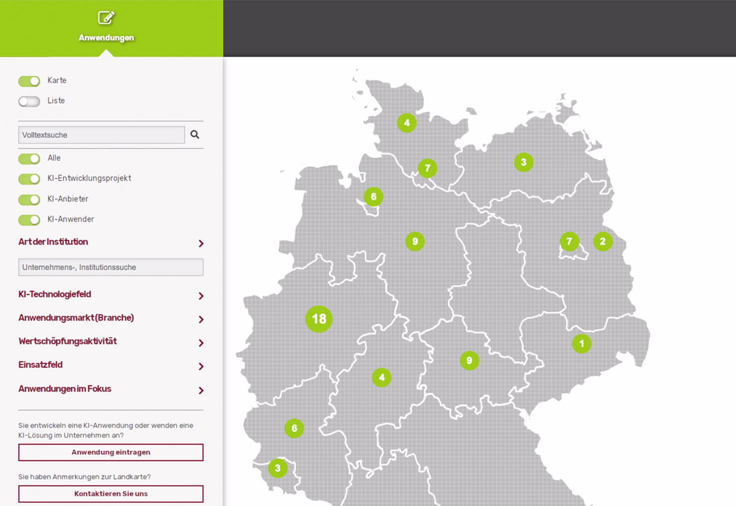Künstliche Intelligenz (KI) kann einen wichtigen Beitrag zu einer nachhaltigen Entwicklung leisten. Sie optimiert bestehende Prozesse in puncto Energie- und Ressourcenverbrauch und ermöglicht die Entwicklung neuer, nachhaltiger Produkte und Geschäftsmodelle. Im Vorfeld zum Digital-Gipfel des Bundesministeriums für Wirtschaft und Energie (BMWi) zeigt die Plattform Lernende Systeme auf ihrer KI-Landkarte nachhaltige KI-Anwendungen aus Deutschland, die zum Beispiel eine emissionsarme Energieversorgung, bessere medizinische Versorgung oder umweltschonende Landwirtschaft fördern.