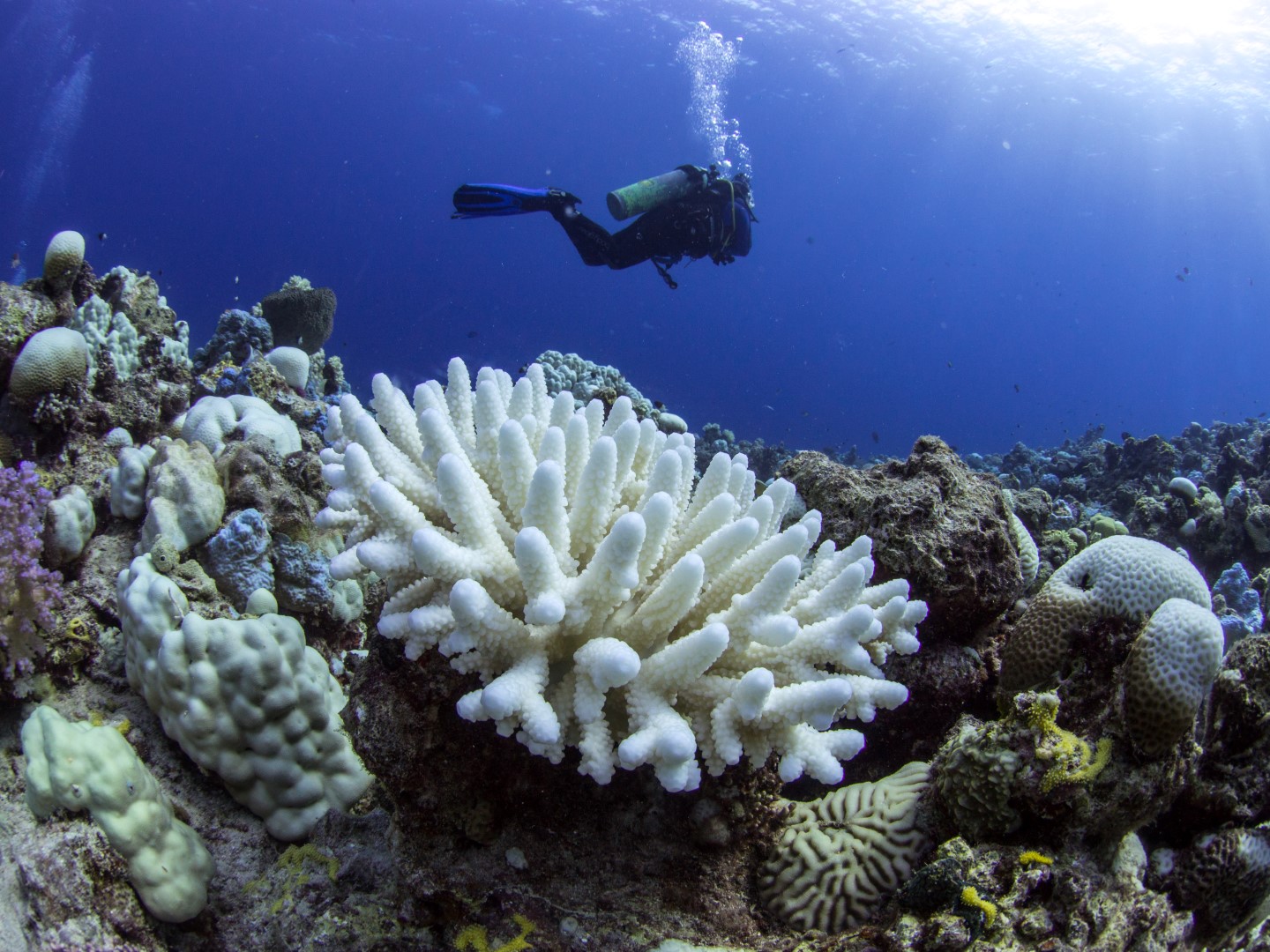 Die Korallenbleiche ist eine große Bedrohung für Riffe weltweit. Die Erwärmung der Ozeane als Folge des Klimawandels kann dazu führen, dass Korallen in einer Stressreaktion ihre Algen-Symbionten abstoßen. So verlieren die Korallen ihre Farbgebung, das darunter liegende weiße Skelett kommt zum Vorschein. Eine Bleiche bedeutet nicht sofort ein Absterben aller Tiere, aber sie erhöht das Risiko für Krankheit und Tod.