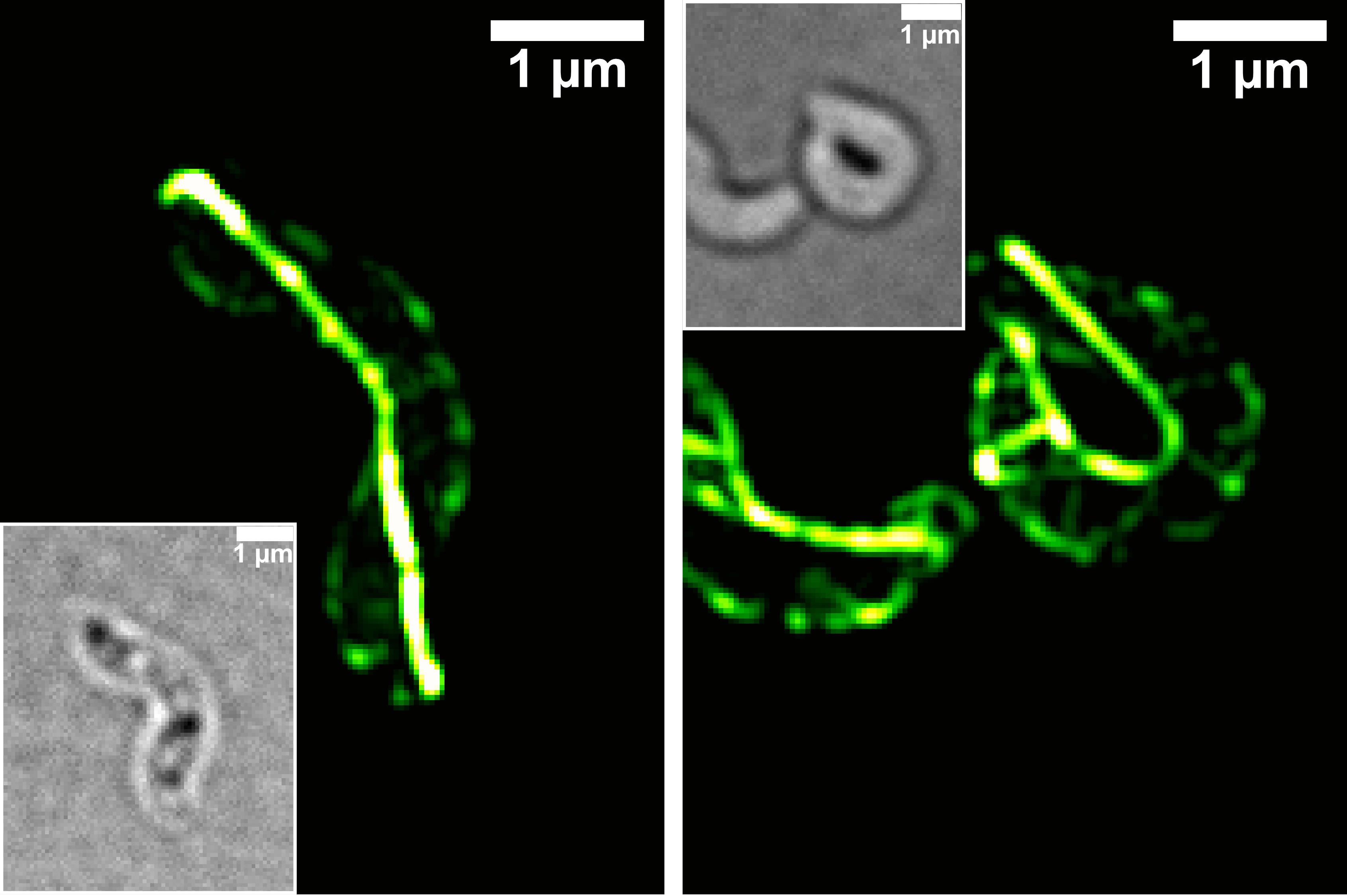 Magnetotactic bacteria of the species Magnetospirillum gryphiswaldense are unicellular organisms that live mainly in the mud at the bottom of shallow freshwater habitats. Intracellular nanoparticles, the magnetosomes, give these bacteria an unusual ability to navigate and orient their locomotion to the Earth's magnetic field. Like all living cells, their cytoskeleton comprises a complex network of thin protein filaments. How this cellular network contributes to the characteristic curvature of the bacteria, and whether there is a link to structures that control the formation and localisation of magnetosome chains was previously unknown.