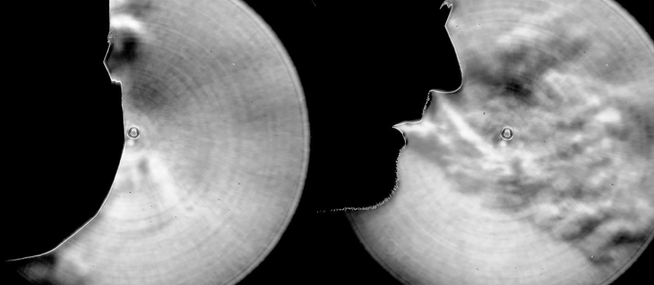 Um das Experiment durchzuführen, wird Licht auf einen circa 50 Zentimeter großen Parabolspiegel gelenkt. Dieser ist als heller Kreis hinter dem Schattenriss der Person zu erkennen, die mal mit, mal ohne Maske atmet und spricht. Der wie die Innenseite eines Suppenlöffels geformte Parabolspiegel bündelt das Licht in einer Entfernung von drei Metern zu einem winzigen Lichtpunkt, der gerade mal so groß ist wie der Durchmesser von fünf menschlichen Haaren. Auf dem Weg Richtung Kamera wird dieser Lichtpunkt durch eine Halbblende zum Teil verdeckt. „Treten in diesem Lichtweg kleinste Temperaturunterschiede auf – etwa durch die im Vergleich zur Umgebung wärmere Atemluft – wird mal mehr, mal weniger Licht ausgeblendet und wir erhalten ein Bild mit starken Kontrasten“, erläutert Jun. Prof. Dr. Ludwig.