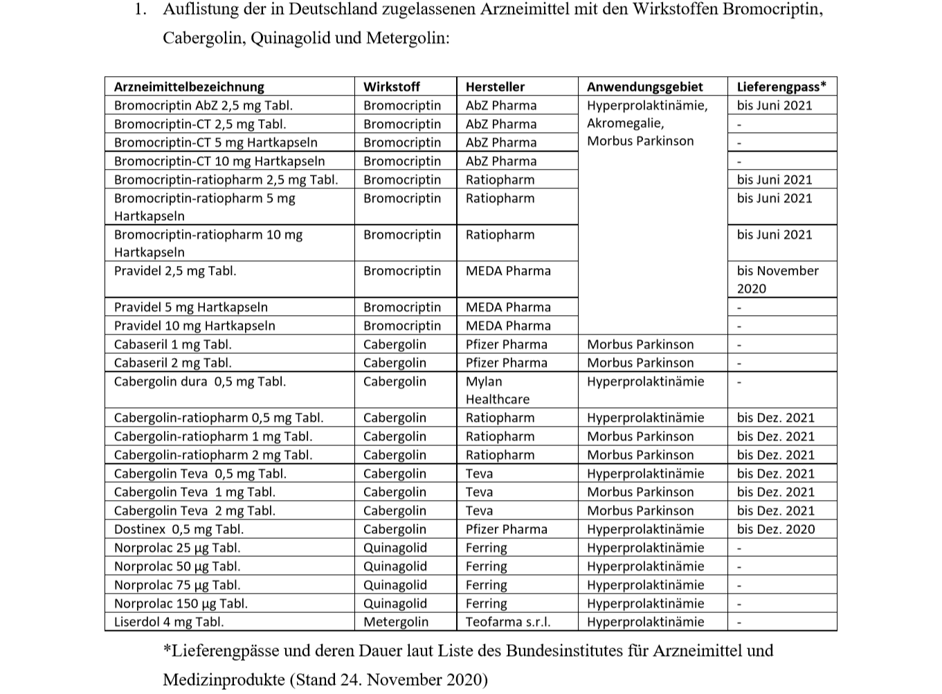 1. Auflistung der in Deutschland zugelassenen Arzneimittel mit den Wirkstoffen Bromocriptin, Cabergolin, Quinagolid und Metergolin