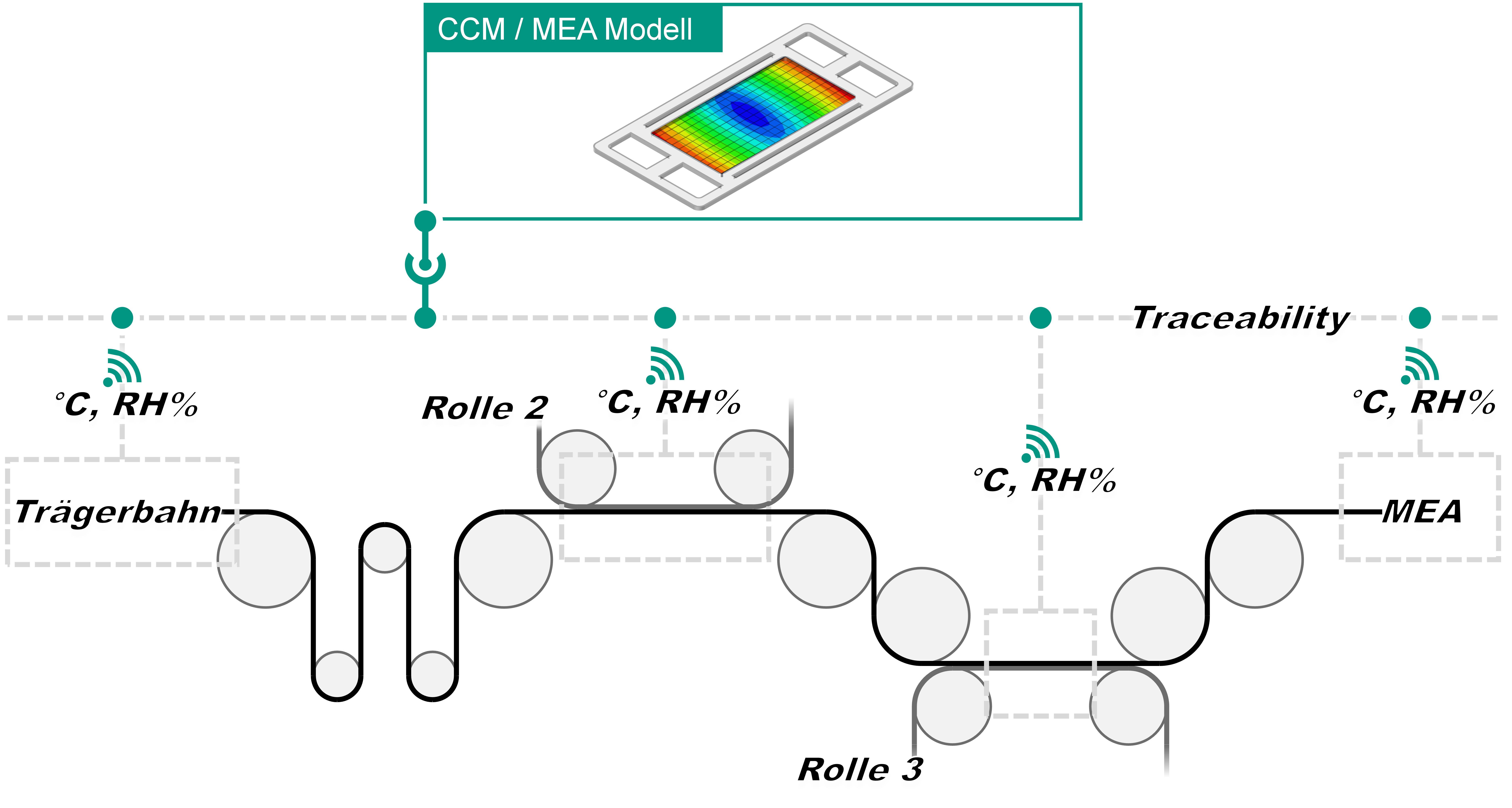 „KliMEA“ steht für „Klimaadaptive und modellgestützte Membrane-Electrode-Assembly-Fertigung“. Das wbk leitet das Projekt mit zwei Fachbereichen. Als Projektpartner untersucht die Arbeitsgruppe Thin Film Technologies (TFT) des KIT vor allem das Feuchtigkeitsaufnahmeverhalten der PEM. Dieses Bauteil beeinflusst das Verhalten der MEA wesentlich. Es wird länger oder kürzer, wenn sich die Luftfeuchtigkeit verändert. Ein Team des wbk untersucht darauf aufbauend in Simulationen genauer, wie sich die Veränderungen der PEM auf die MEA auswirken, um so das nötige Prozesswissen zu erlangen. Mittels eines „digitalen Zwillings“, also einer betriebsbegleitenden Simulation, die sehr realitätsnah und ausreichend detailliert das System digital widerspiegelt, untersucht das zweite Forschungsteam des wbk die Verknüpfung mit der realen Anlage und leitet geeignete Messstrategien ab. Die erhobenen Daten sind entscheidend für die Qualitätssicherung und zugleich für die Rückverfolgbarkeit (Traceability). Auf dieser Basis lässt sich entscheiden, ob hinsichtlich einer bestimmten Baugruppe ein Risiko besteht und Gegenmaßnahmen ergriffen werden müssen.