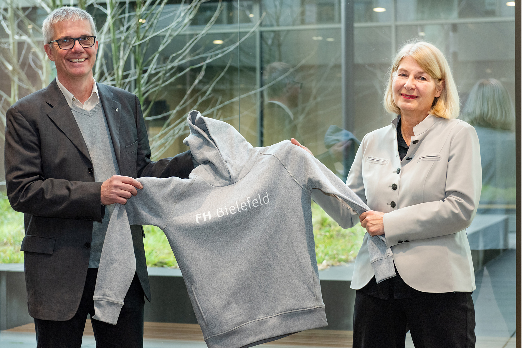 Bielefeld (fhb). Die bisherige Präsidentin der Fachhochschule Bielefeld wird auch künftig an der Spitze von Ostwestfalen-Lippes größter Fachhochschule stehen: Am heutigen Freitag, den 4. Dezember 2020, wurde Prof. Dr. Ingeborg Schramm-Wölk für weitere vier Jahre im Amt bestätigt. Der Vorsitzende der Hochschulwahlversammlung, Prof. Dr. Hans Brandt-Pook, gratulierte der alten und neuen Präsidentin im Hauptgebäude am Campus Bielefeld. Neben einem Blumenstrauß hatte Brandt-Pook einen gemütlichen „Hoodie“ aus dem FH-Shop im Gepäck – für den legeren Homeoffice-Dress. „In Corona-Zeiten genau das richtige Gratulationsgeschenk“, so Brandt-Pook.