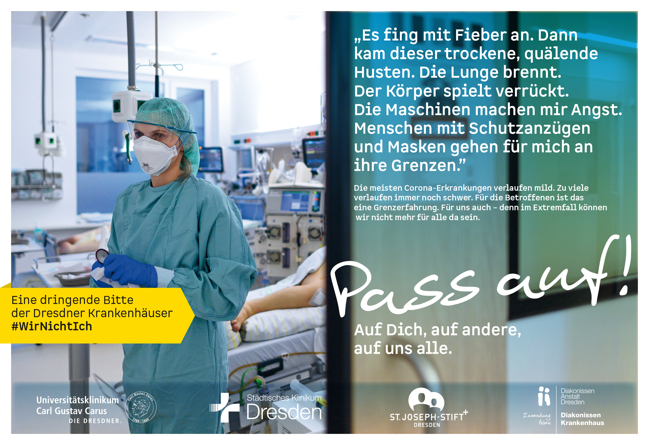 "Pass auf! – Auf Dich, auf Andere, auf uns Alle“ – mit diesem gemeinsamen Appell richten sich die Dresdner Kliniken an die Menschen ihrer Region, um auf die sich zuspitzende Lage bei der Versorgung von COVID-19-Patienten aufmerksam zu machen. Inzwischen hat der massive Anstieg der von schweren gesundheitlichen Problemen betroffenen Infizierten auch die Dresdner Krankenhäuser an ihre Kapazitätsgrenzen gebracht.