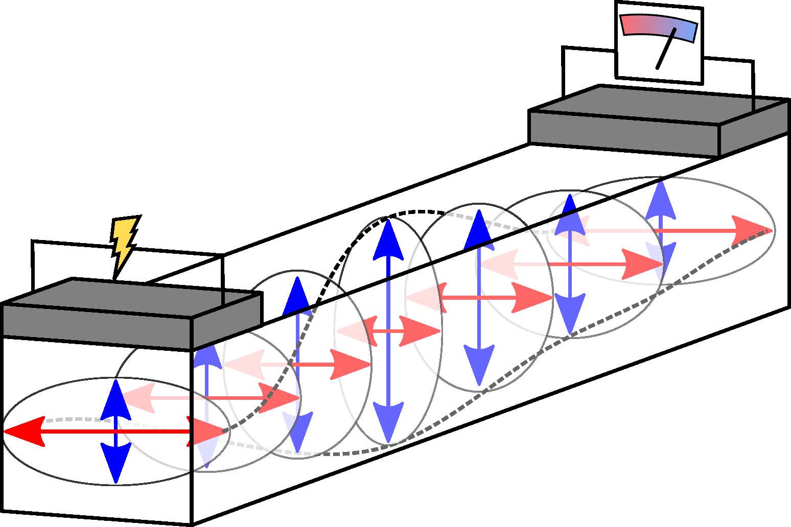 An electrical current excites the superposition of two magnons with linear polarization (indicated by the red and blue arrows). Subsequently, energy is transported through the antiferromagnetic insulator. This can be detected as electrical voltage.