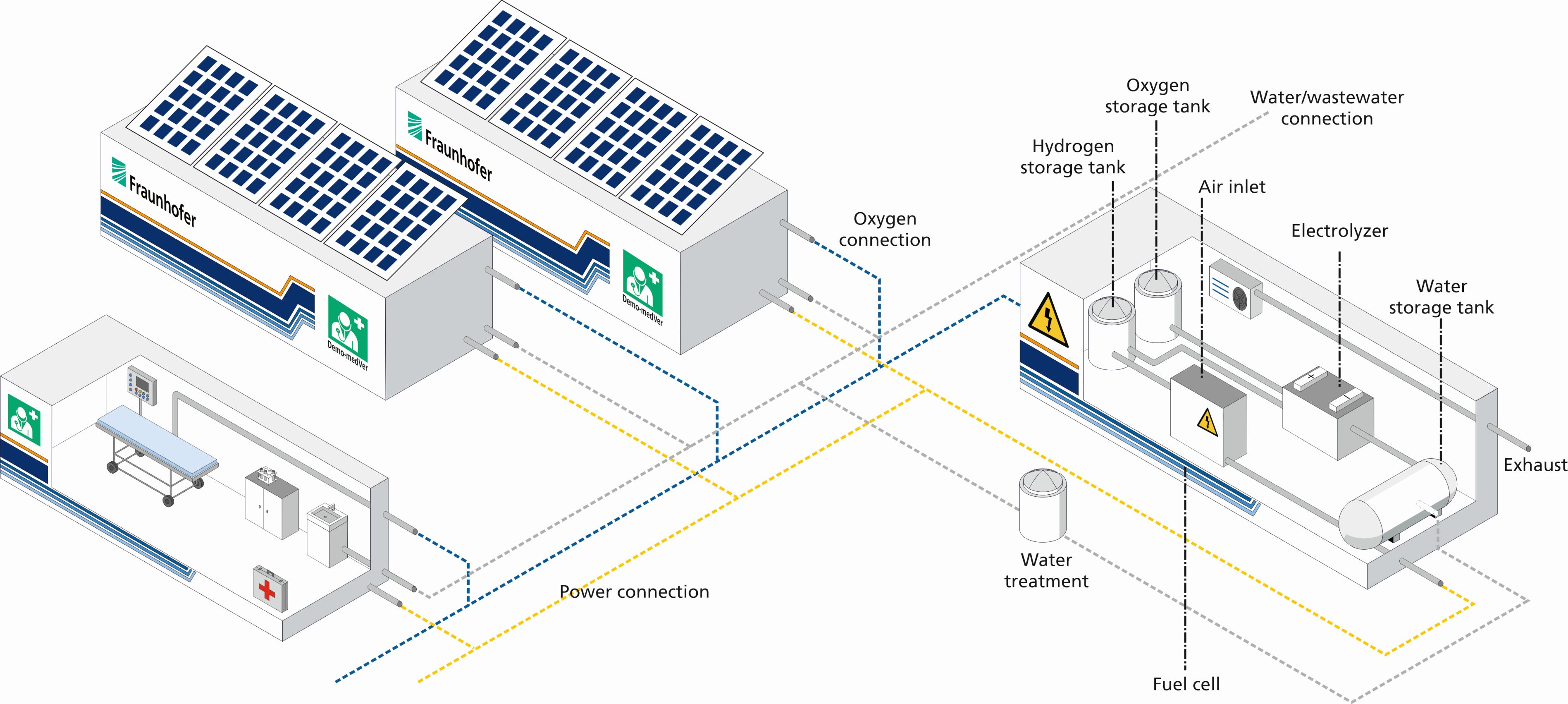 Another fundamental requirement for mobile operation is a reliable and readily available power supply. The development of a self-sufficient energy supply is therefore one of the most important aspects of the project. An energy supply system solely based on photovoltaics can do this, for instance. This will make it possible to use the system in regions without any connection to the electricity grid or where frequent power outages are common. The power supply must be also be guaranteed whenever solar output cannot be produced for a number of days. Adequate storage capacities must be kept in reserve too in conjunction with a smart energy management plan. Redundancy in the event of malfunctions must also be ensured to be able to supply cooling systems, emergency lighting and other important energy consumers with power for a certain period.