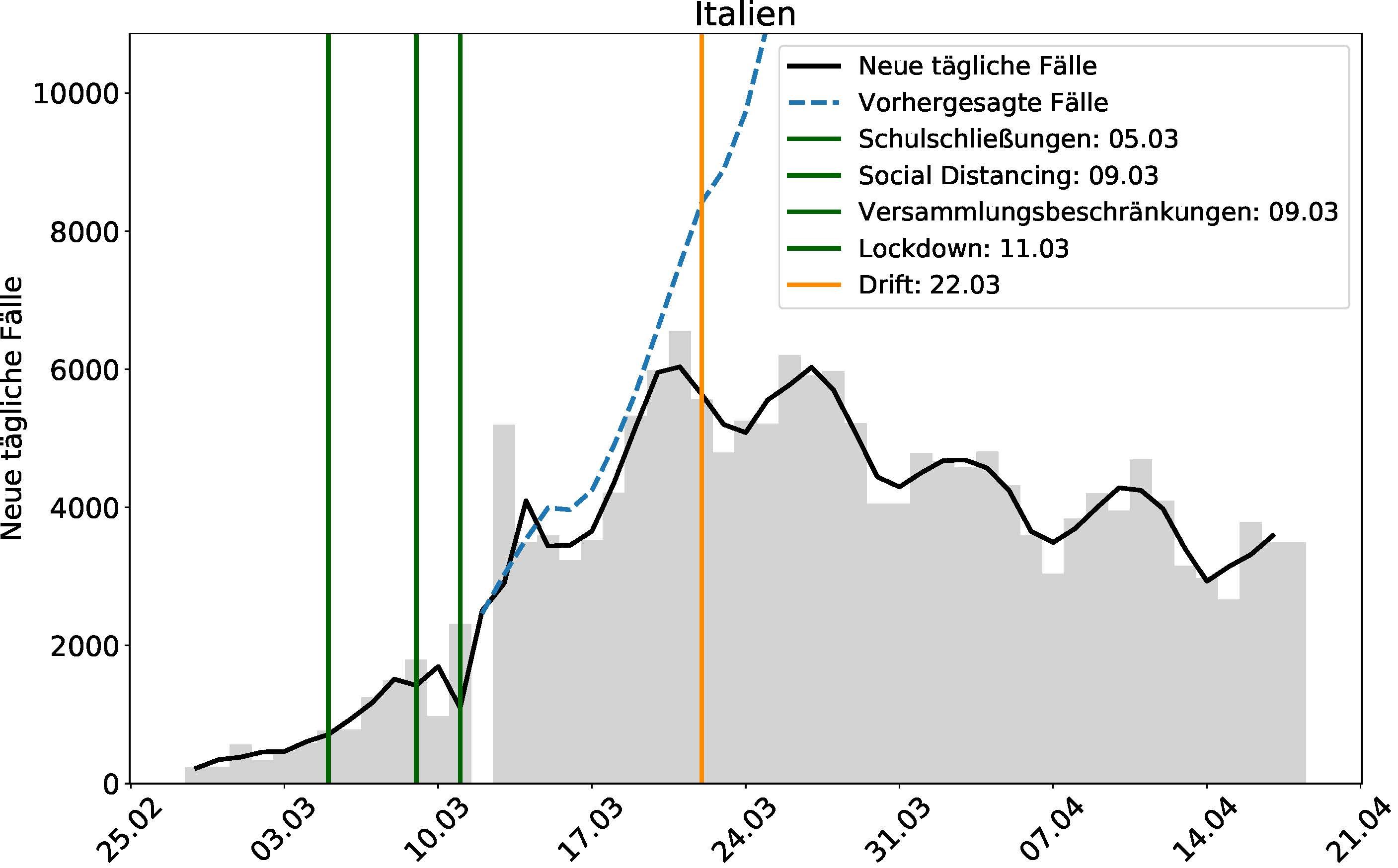Für faktenbasierte Aussagen über die Effektivität von Maßnahmen gegen die Corona-Pandemie nutzten die Wissenschaftler Lucas Baier, Niklas Kühl, Jakob Schöffer und Gerhard Satzger vom KIT die Concept Drift-Erkennung. Diese Methode aus dem Gebiet des Maschinellen Lernens wird angewandt, um eine strukturelle Veränderung – einen sogenannten Drift – in einer datenerzeugenden Umgebung zu erkennen. „Als in der Bekämpfung der Corona-Pandemie öffentlich die Frage diskutiert wurde, wann eine Maßnahme sich auf die Fallzahlen auswirke, haben wir entschieden, Verfahren aus diesem Bereich zu verwenden, um dies festzustellen“, sagt Kühl. Üblicherweise dient die Concept Drift-Erkennung dazu, KI robust zu gestalten: Es soll sichergestellt werden, dass die mit vorhandenen Daten trainierte KI im Einsatz erkennt, wenn sich die Umgebung ändert. Somit soll sie auch bei Eingangsdaten, die vom Gelernten abweichen, kontinuierlich akkurat weiterarbeiten. Die Wissenschaftler haben sich die Methode zunutze gemacht, um eine fundamentale Änderung der Daten zu erkennen und mit der vorangegangenen Einführung einer NPI in Beziehung zu setzen. „Unsere Analyse zeigt, wie wichtig eine rechtzeitige Reaktion auf die Ausbreitung der Pandemie ist, um die aktiven Fälle auf einem überschaubaren Niveau zu halten“, schreiben die Karlsruher Wissenschaftler. Mit ihrer Untersuchung wollen sie zur faktenbasierten Grundlage für nationale und übernationale gesundheitspolitische Entscheidungen beitragen.