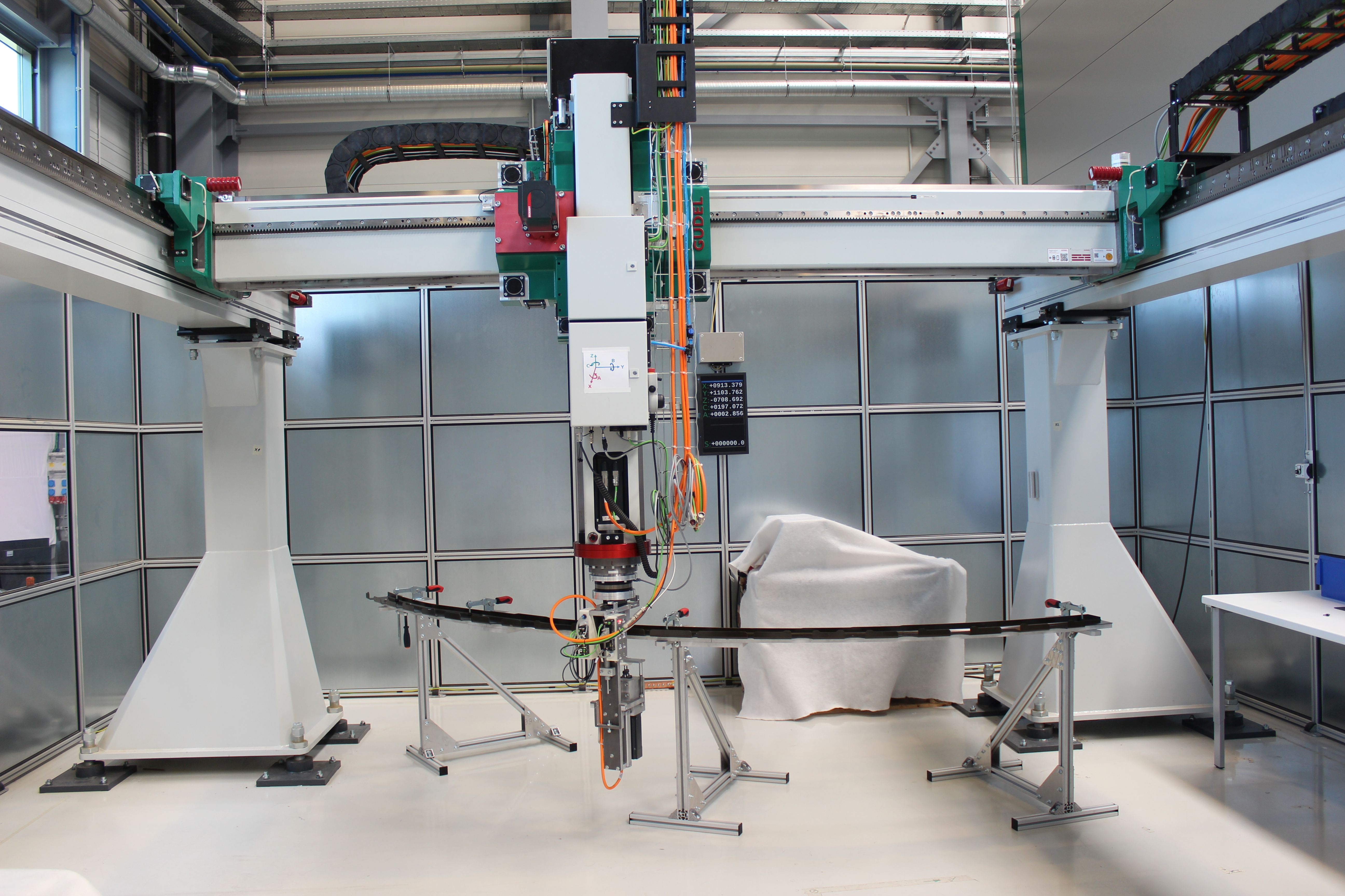 Automation is one of the most important strategies for increasing efficiency in production. The positioning and drilling end effector newly developed for a portal system to automate the pre-assembly of stiffening elements (cleats) on CFRP integral frames for the manufacture of aircraft fuselages – made available by project partner Airbus Hamburg – enables production rate increases both with constant quality and at lower costs. The previous manual production also required more process steps.