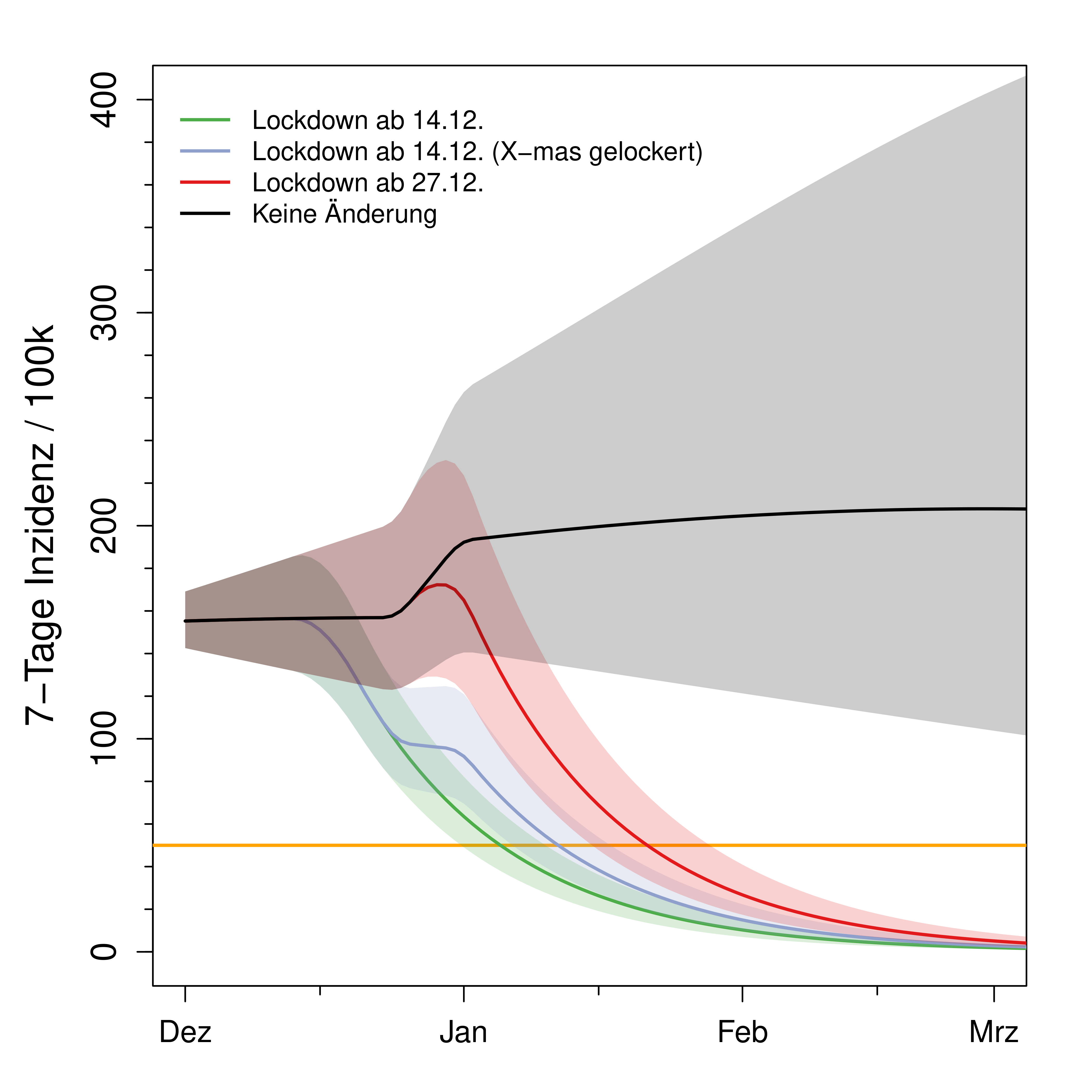 Die Wissenschaftler haben jetzt verschiedene Lockdown-Szenarien durchgerechnet, um sichtbar zu machen, wie lange man in Deutschland noch mit hohen Infektionszahlen zu kämpfen habe, selbst wenn die Landesregierungen jetzt schnell handeln und einen strikteren Lockdown über einen längeren Zeitraum verhängen würden. „Wir haben zum einen durchgespielt, wie sich die Lage entwickeln könnte, wenn ab dem 14. Dezember ein Lockdown wie im vergangenen März stattfinden würde, man also auf Online-Unterricht an den Schulen umsteigen würde und nur noch lebensnotwendige Geschäfte und Einrichtungen wie Arztpraxen geöffnet ließe. Wir haben dann geschaut, wie sich Lockerungen über Weihnachten auswirken werden. In einer dritten Variante haben wir den harten Lockdown auf den 27. Dezember terminiert“, erläutert Thorsten Lehr (siehe Infografiken).