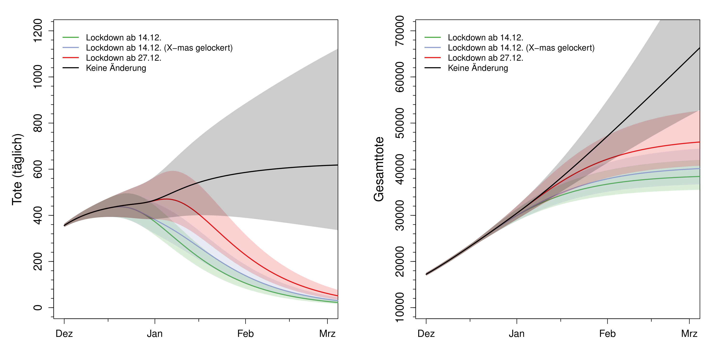Forscher der Universität des Saarlandes haben verschiedene Lockdown-Szenarien simuliert. Sie zeigen darin, dass man in Deutschland nur mit einem harten Lockdown, der schnellstmöglich umgesetzt werden sollte, die Covid-19 Infektionslage wieder in den Griff bekommen könne. Die geplante Lockerung über Weihnachten sei zudem problematisch, weil sie flächendeckend die Infektionsrate wieder erheblich steigern würde. Selbst mit frühen Maßnahmen könne man schon nicht mehr verhindern, dass bis Jahresende die Sterbezahlen auf 30.000 ansteigen werden. Nur durch einen flächendeckenden harten und raschen Lockdown könne man eine Verdoppelung der aktuellen Sterbezahlen bis Mitte Januar verhindern.