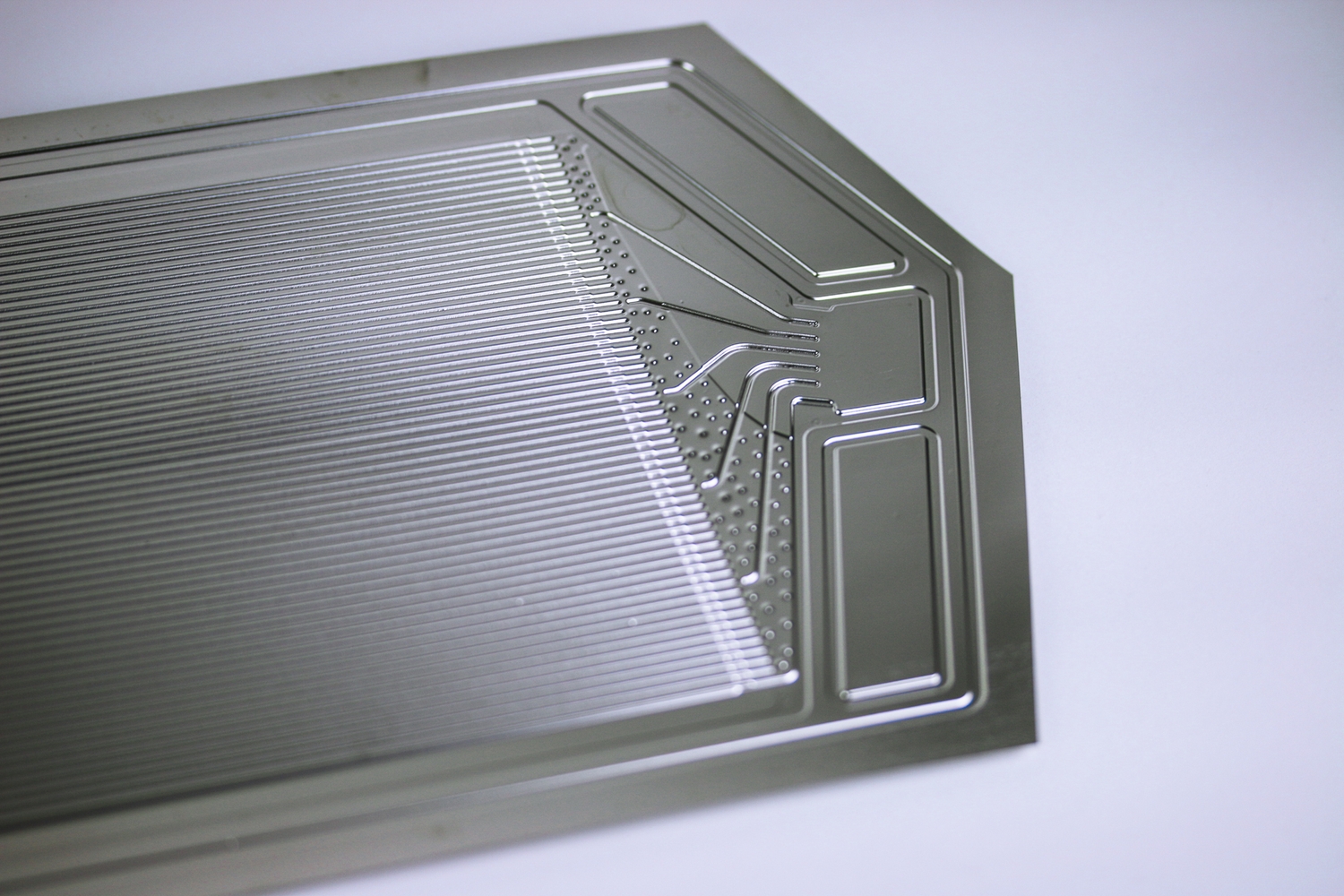 Beim Hydroforming, auch Hochdruck-Blechumformung (HBU) genannt, werden dünne Metallfolien mit einer Stärke von 0,05 mm bis 0,1 mm mit Wasser in die Form einer Bipolarplatte gepresst. Dabei wirkt ein Druck von 200 Megapascal (MPa). Im Vergleich zu herkömmlichen Verfahren lassen sich Bipolarplatten auf diese Weise präziser ausformen und federn weniger zurück. Es entstehen also mehr qualitativ hochwertige Platten. Zudem wird nur eine Anpressform benötigt. »Wir haben die Flussfeldgeometrie unserer Bipolarplatte so weiterentwickelt, dass diese neben den gängigen auch mit alternativen Verfahren, wie zum Beispiel dem kontinuierlichen Walzprägen, herstellbar ist. Das ist der nächste Technologieschritt in Richtung Massenfertigung. Dabei ändert sich am Wirkungsgrad der Brennstoffzellen nichts: er bleibt stabil auf hohem Niveau«, erläutert Sebastian Melzer, Wissenschaftlicher Mitarbeiter in der Abteilung für Blechbearbeitung am Fraunhofer IWU. »Wir wollen eine Produktionsrate von mindestens 120 Bipolarplatten pro Minute erreichen. Das ist ungefähr das Doppelte von dem, was Industrieunternehmen momentan mit klassischem Tiefziehen oder Prägen schaffen.«