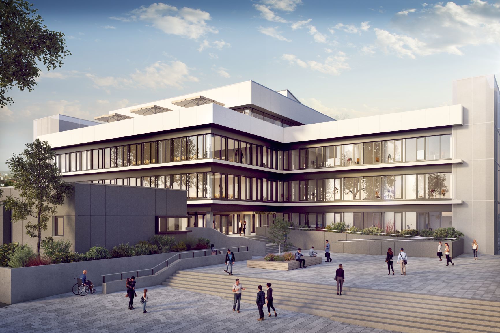Im August 2020 ist die Evangelische Hochschule mit der Mehrzahl ihrer 70 Mitarbeitenden aus dem sogenannten Altbau in das Wohnheim gezogen. Auch die Bibliothek, Seminarräume, PC-Arbeitsplätze für Studierende sowie einige Forschungsinstitute befinden sich dort. Das Rektorat und die Stabsstellen haben ihre Büros seither im Hochschul-Neubau, dem Kubus, auf dem Campus Freiburg-Weingarten.