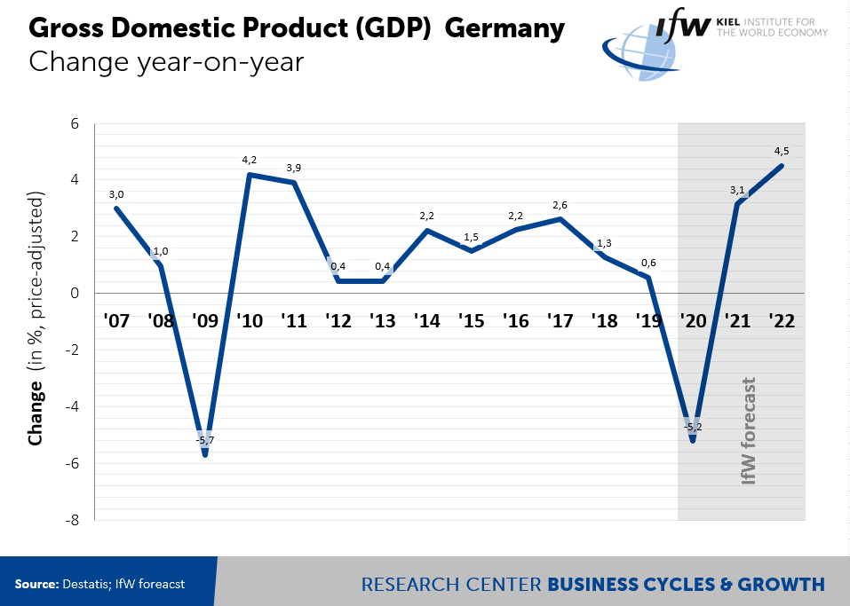 The second wave of the Corona pandemic deals a noticeable blow at Germany’s economy, but does not overturn it. The recovery is interrupted for six months, but then comes back strongly. The Kiel Institute lowers its forecast for gross domestic product (GDP) growth in 2021 by 1.7 percentage points to 3.1%. The main negative effect stems from stricter social distancing regulations that impede many consumer-related sectors during the winter half-year. The slight upward revision of the current year’s GDP number (slump of 5.2% vs. previous forecast of 5.5%) is due to a stronger than expected rebound in the third quarter. The forecast assumes that the pandemic will be overcome by next fall.