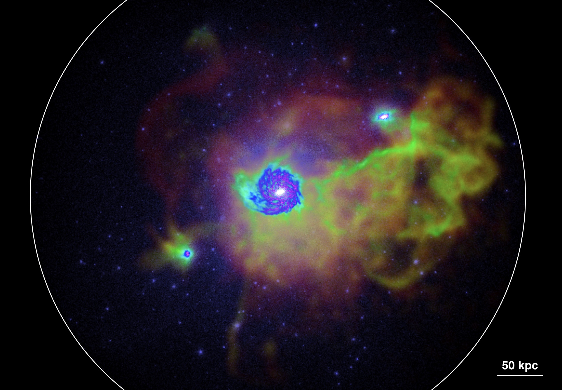 Visualisierung des Gases in und um eine milchstrassenähnliche Galaxie (Mitte) im heutigen Universum, wie sie von einer kosmologischen Simulation des Autors vorhergesagt wird. Dichter, atomarer und molekularer Wasserstoff bildet typischerweise eine ausgedehnte Scheibe, hier in bläulich-violett in der Mitte des Bildes. Sterne (weiss) bilden sich überall in der Gasscheibe. Zusätzliche Sternentstehung kann in Satellitengalaxien stattfinden, hier zu sehen an den Positionen oben rechts und unten links. Heisses Gas mit geringer Dichte (grüne und rote Farbtöne) kann in grossen Entfernungen gefunden werden, bis hin zum Rand des Halos aus dunkler Materie, der die Hauptgalaxie (weisser Kreis) umgibt. Das Bild zeigt auch eine grosse Anzahl von Substrukturen aus dunkler Materie (violett), von denen die meisten frei von Gas und Sternen sind.