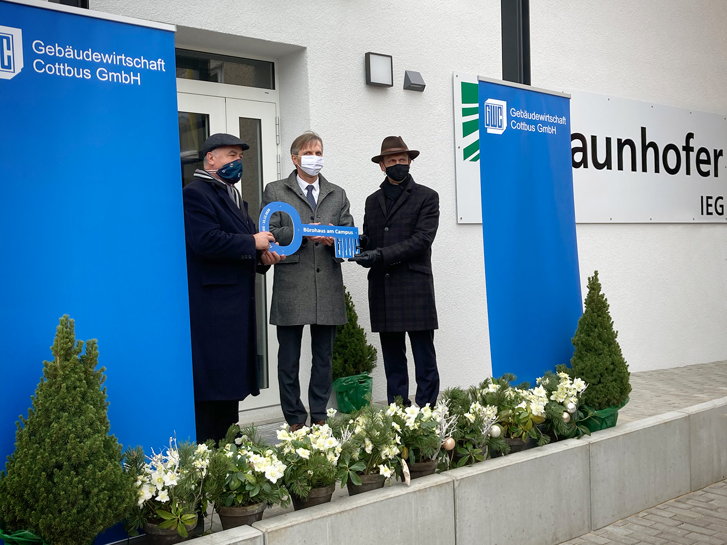 Mit einer symbolischen Schlüsselübergabe durch Oberbürgermeister Holger Kelch bezieht das Fraunhofer IEG seine neue Heimat in Cottbus. Das modernisierte Bürohaus am Campus wird der Arbeitsplatz für zunächst fünfzehn Mitarbeiterinnen und Mitarbeitern und bietet Platz für weitere Kolleginnen und Kollegen, die in den nächsten Monaten dazustoßen werden.