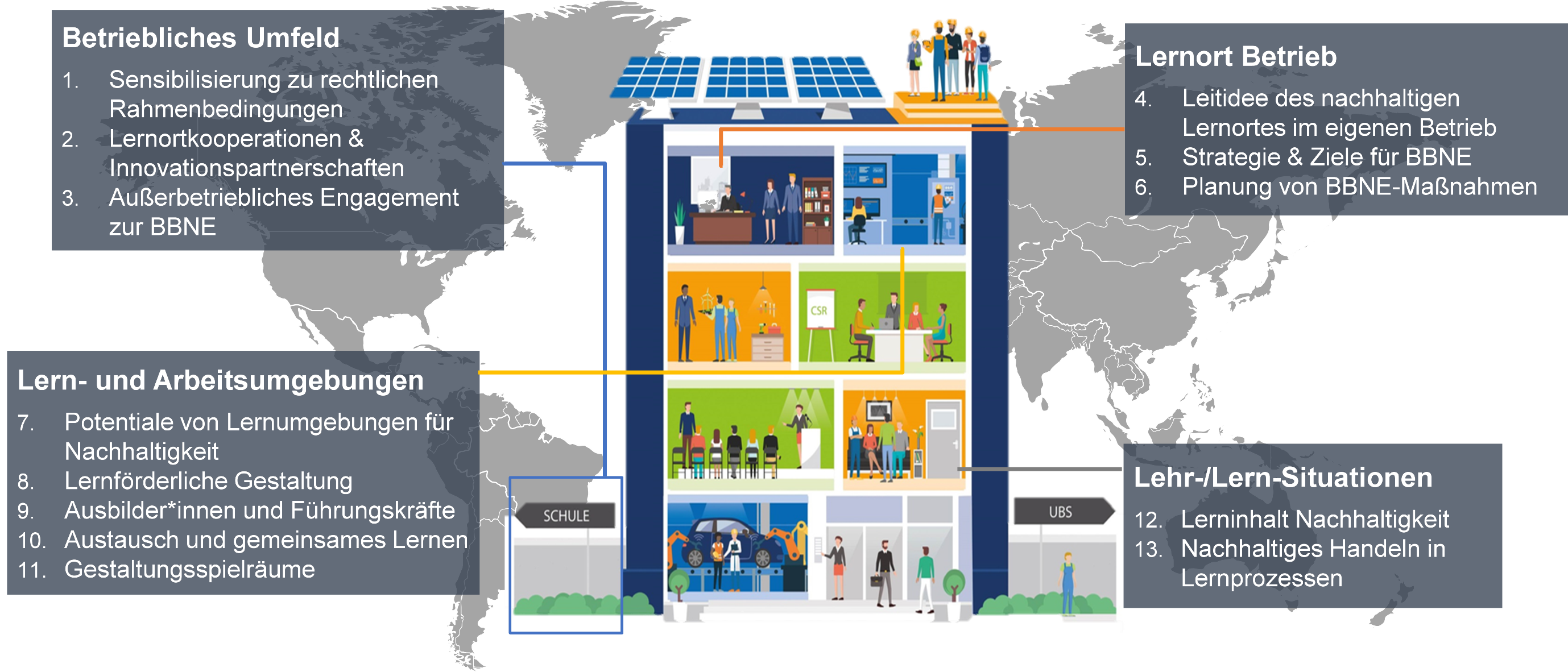 Die Praxishandreichung unterscheidet vier Gestaltungsbereiche für Betriebe. In diesen Bereichen finden sich 13 individuell gestaltbare Handlungsfelder mit Indikatoren, mit deren Hilfe auch kleine Verbesserungen messbar gemacht werden können. So können Unternehmen einschätzen, in welchen Bereichen sie schon gut aufgestellt sind und welche Ziele noch eine Reise wert sind. Außerdem werden sie motiviert, auch über die gesetzlichen Mindeststandards hinauszugehen. Schließlich bergen die über 400.000 Ausbildungsbetriebe mit ihrer wichtigen Rolle bei der Qualifizierung und Persönlichkeitsentwicklung junger Menschen ein hohes Potenzial, nachhaltige Entwicklung zu fördern und zur Erreichung der Nachhaltigkeitsziele beizutragen.
