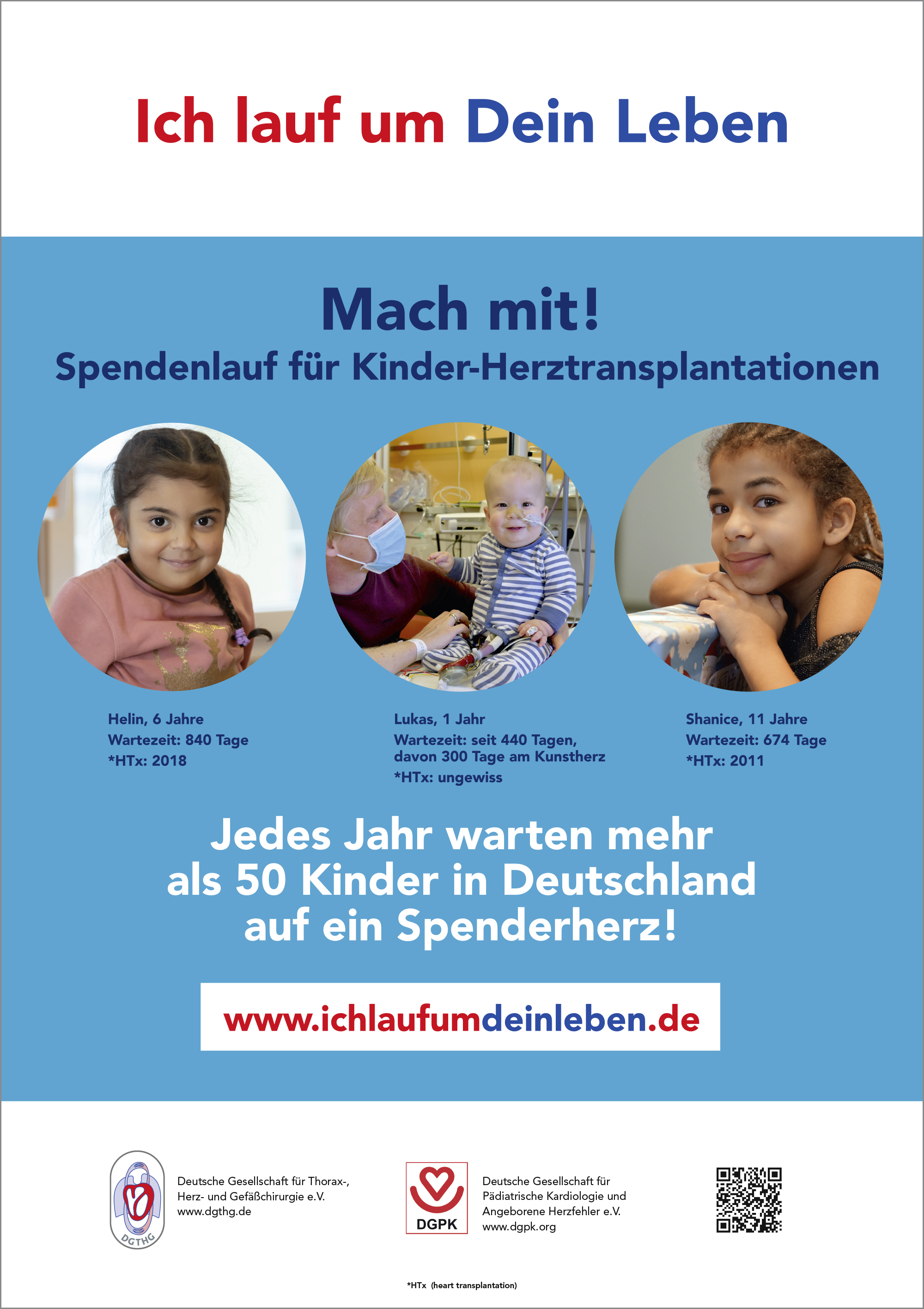Um auf dieses wichtige Thema besonders aufmerksam zu machen, starten die Deutsche Gesellschaft für Thorax-, Herz- und Gefäßchirurgie e.V. (DGTHG) und die Deutsche Gesellschaft für Pädiatrische Kardiologie und Angeborene Herzfehler e.V. (DGPK) daher zum 11. Januar 2021 einen virtuellen Spendenlauf. Damit wollen die herzmedizinischen Fachgesellschaften im Rahmen ihrer digitalen Jahrestagungen Herzmedizin 2021 speziell das Thema Kinderherztransplantationen ins Bewusstsein der Öffentlichkeit rufen, um durch die Spenden Kindern, die ein Spenderorgan benötigen, noch gezielter helfen zu können. Der Erlös wird das bundesweit tätige Aktionsbündnis Angeborene Herzfehler e.V. unterstützen, in dem sechs Patientenvertretungen für angeborene Herzfehler vereint sind, um mit gemeinsamen Kräften Kindern, Jugendlichen und Erwachsenen mit angeborenen Herzfehlern zu helfen.