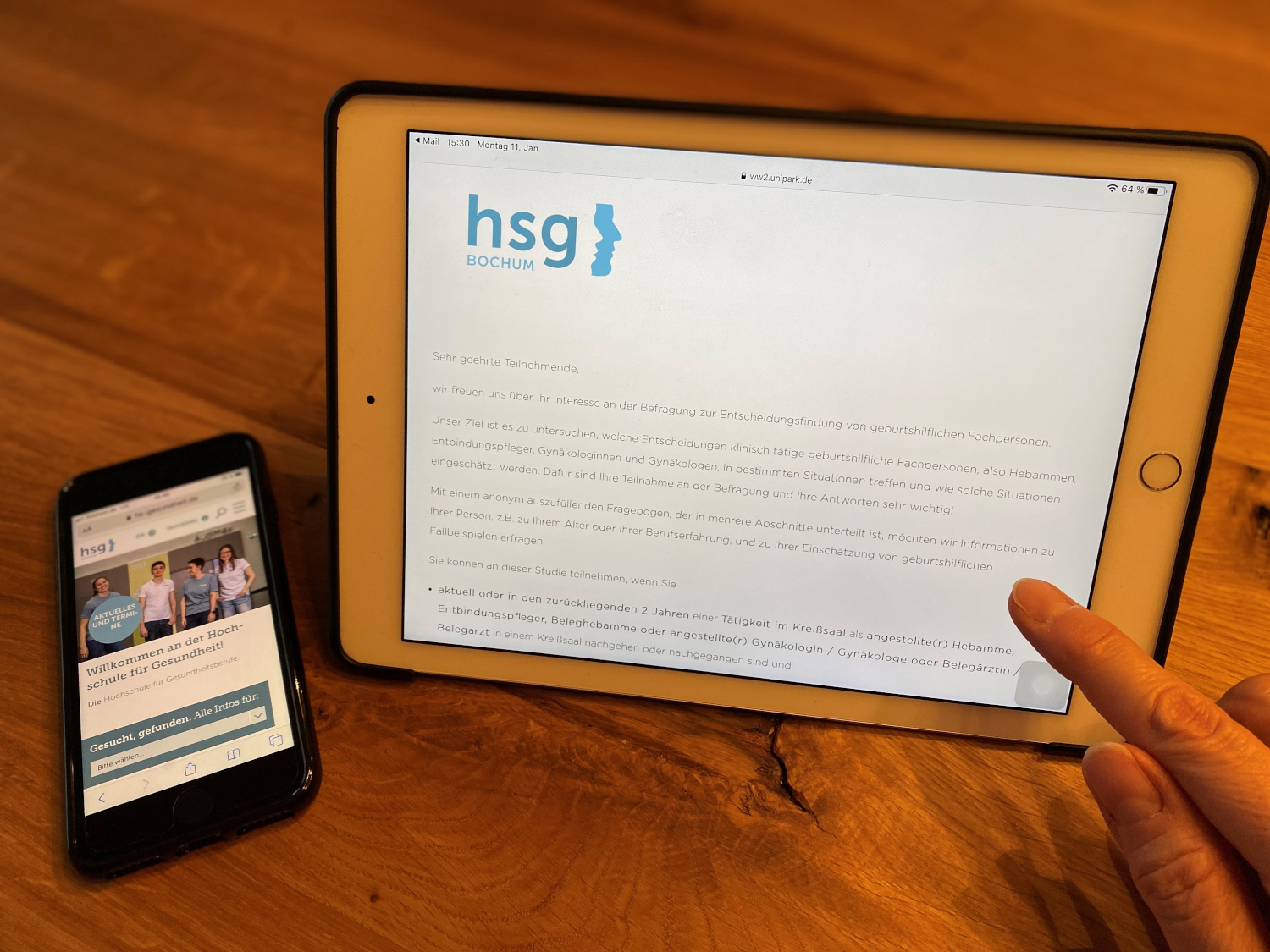 Derzeit findet an der Hochschule für Gesundheit (hsg Bochum) unter der Betreuung von Dr. Rainhild Schäfers, Professorin im Studienbereich Hebammenwissenschaft der hsg Bochum, und Nina Peterwerth, wissenschaftliche Mitarbeiterin des Studienbereichs, eine Befragung zur Entscheidungsfindung geburtshilflicher Fachpersonen statt. Das Ziel ist es zu untersuchen, welche Entscheidungen klinisch tätige geburtshilfliche Fachpersonen in bestimmten Situationen treffen und wie solche Situationen eingeschätzt werden.