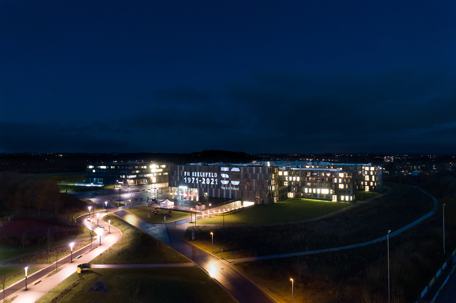 Abschließend noch einmal Ingeborg Schramm-Wölk: „Das 2015 eingeweihte Hauptgebäude der FH Bielefeld ist ein moderner Hochschulbau, der ganz wesentlich dazu beiträgt, dass die Fachbereiche noch näher zusammenrücken. Die daraus resultierende Intensivierung der interdisziplinären Kooperation ist ein ganz wesentliches Erfolgsrezept für die Zukunft. Insofern finde ich es überaus passend, unsere Jubiläumsleitlinie ‚50 Jahre Zukunft‘ auf das Hauptgebäude zu projizieren.“