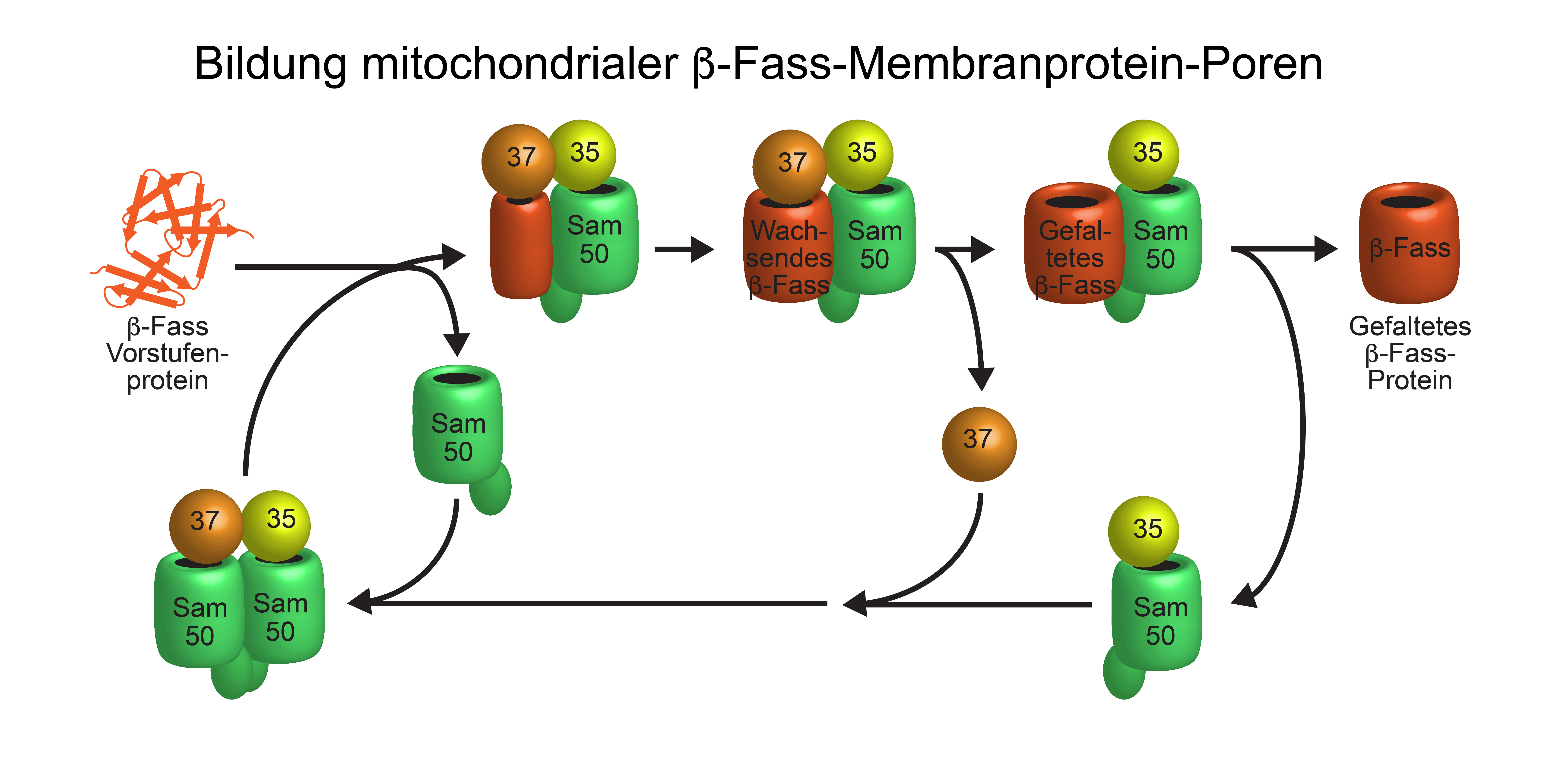 Der SAM-Komplex besteht typischerweise aus zwei Beta-Fass-Untereinheiten mit dem Namen Sam50, die auf ihrer Außenseite wiederum von den Untereinheiten Sam35 und Sam37 bedeckt werden. Die Forschenden fanden heraus, dass der SAM-Komplex, während er ein neues Beta-Fass-Protein bildet, nur ein Sam50 enthält. Die zweite Beta-Fass-Untereinheit wirkt als flexibler Platzhalter: Sie verlässt vorübergehend den SAM-Komplex und gibt den Platz für das neu zu bildende Beta-Fass-Protein frei. Dieser dynamische Mechanismus erklärt, wie ein neues Beta-Fass-Protein bis zur vollen Größe im SAM-Komplex heranreifen kann und erst als fertig gefaltetes Protein entlassen wird. „Damit konnte ein neues Prinzip für die Bildung von Membranproteinen gefunden werden, die lebenswichtige Funktionen in unseren Zellen ausüben“, erläutert Wiedemann.