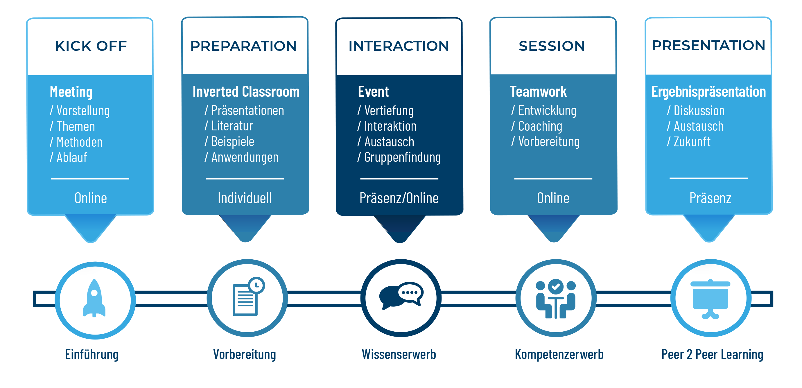 Der Ablauf folgt dem Blended Learning Konzept. Dabei wird das Selbststudium der Lehr- und Gruppenarbeitssession vorangestellt. Die Phasen des Online-Selbststudiums und der Online-Gruppenarbeit werden mit dem Kompetenzerwerb der Präsenzphasen verzahnt, um diese intensiv zur Vertiefung, Anwendung, dem Transfer oder der Präsentation zu nutzen.