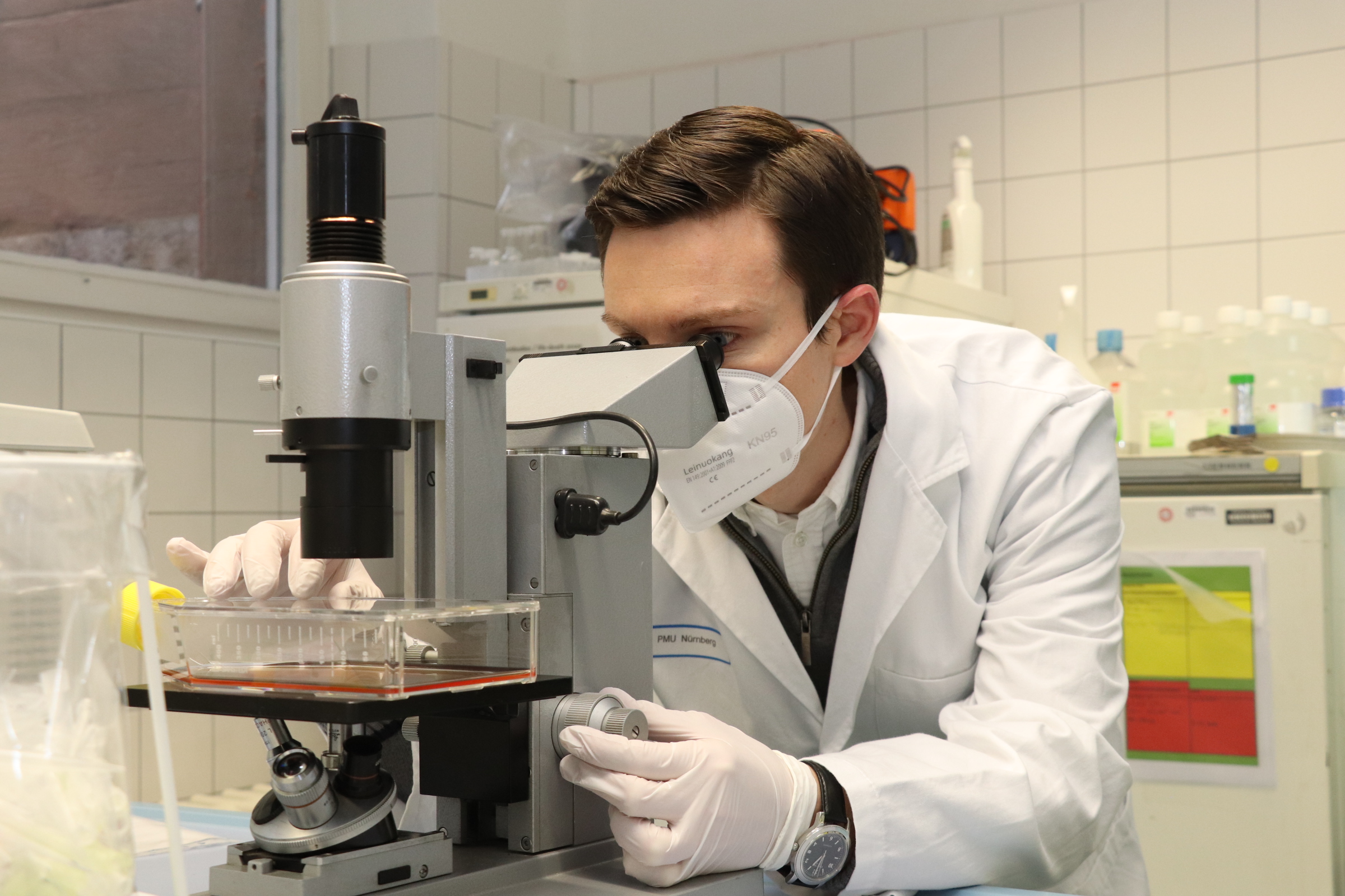 Dr. Clemens Gögele hat in Salzburg Biologie studiert und ist seit 2016 wissenschaftlicher Mitarbeiter im Institut für Anatomie und Zellbiologie der PMU Nürnberg. Hier erforscht er Möglichkeiten des sogenannten Tissue Engineering, also der Gewebekonstruktion und der künstlichen Herstellung von Seh-nen- und Knorpelzellen, von denen zum Beispiel Osteoarthrose-Patienten profitieren. In seiner Ph.D.-Arbeit hat sich Gögele auf das Tissue Engineering speziell für die vordere Kreuzbandplastik fokussiert. Mit Erfolg: Im Oktober 2020 hat er seine Dissertation mit Auszeichnung verteidigt. „Es war eine überaus glückliche Entscheidung, in die Abteilung von Prof. Gundula Schulze-Tanzil zu gehen“, so der 29-Jährige. „Die Rahmenbedingungen für das Forschen sind an der PMU Nürnberg hervorragend. Die enge Vernetzung mit anderen Hoch-schulen und der intensive Austausch mit Kolleginnen und Kollegen aus der medizinischen Praxis ermöglichen ein sehr fruchtbares Arbeiten. Der neue Ph.D.-Studiengang wird die Forschungsleistung sicher noch weiter stärken.“