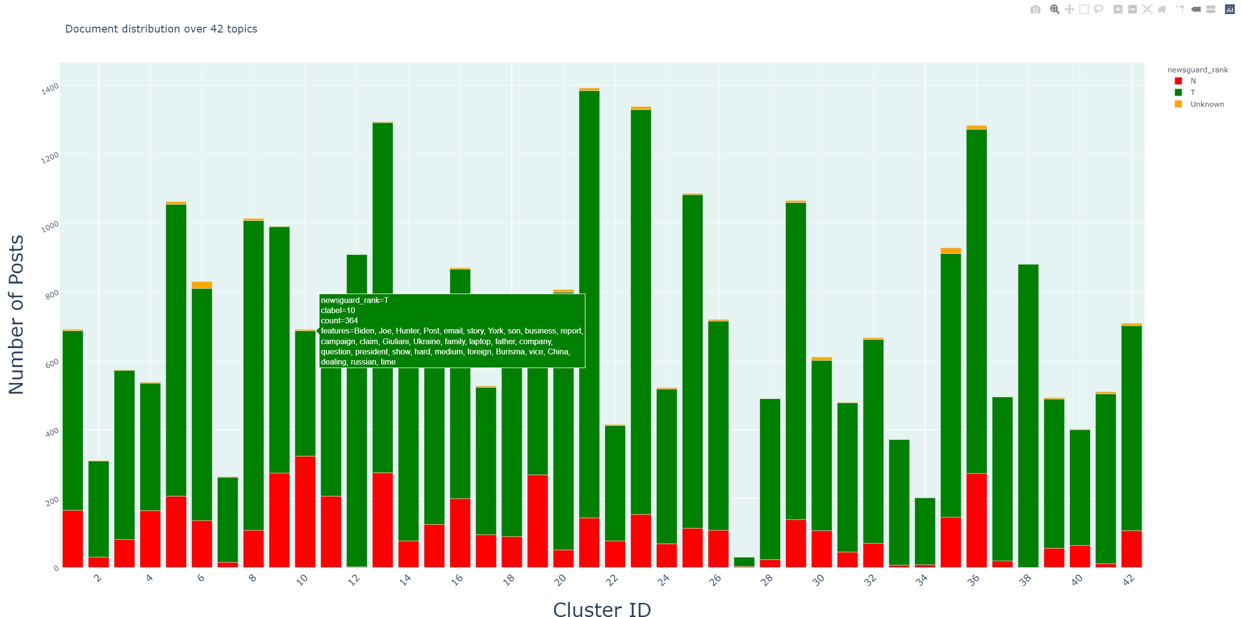 Time patterns are examined for the detection of campaigns. This is based on simple linguistic clustering methods that group media posts by topic for each day. This enables identification of certain topic threads at a very early stage, an insight that is underpinned by the NewsGuard score. With regard to the US election, for instance, it emerged that articles with allegations of corruption and tax evasion against Hunter Biden were initially published by less trustworthy sources starting on October 14, 2020. Only later did the more trustworthy sources also pick up the topic.