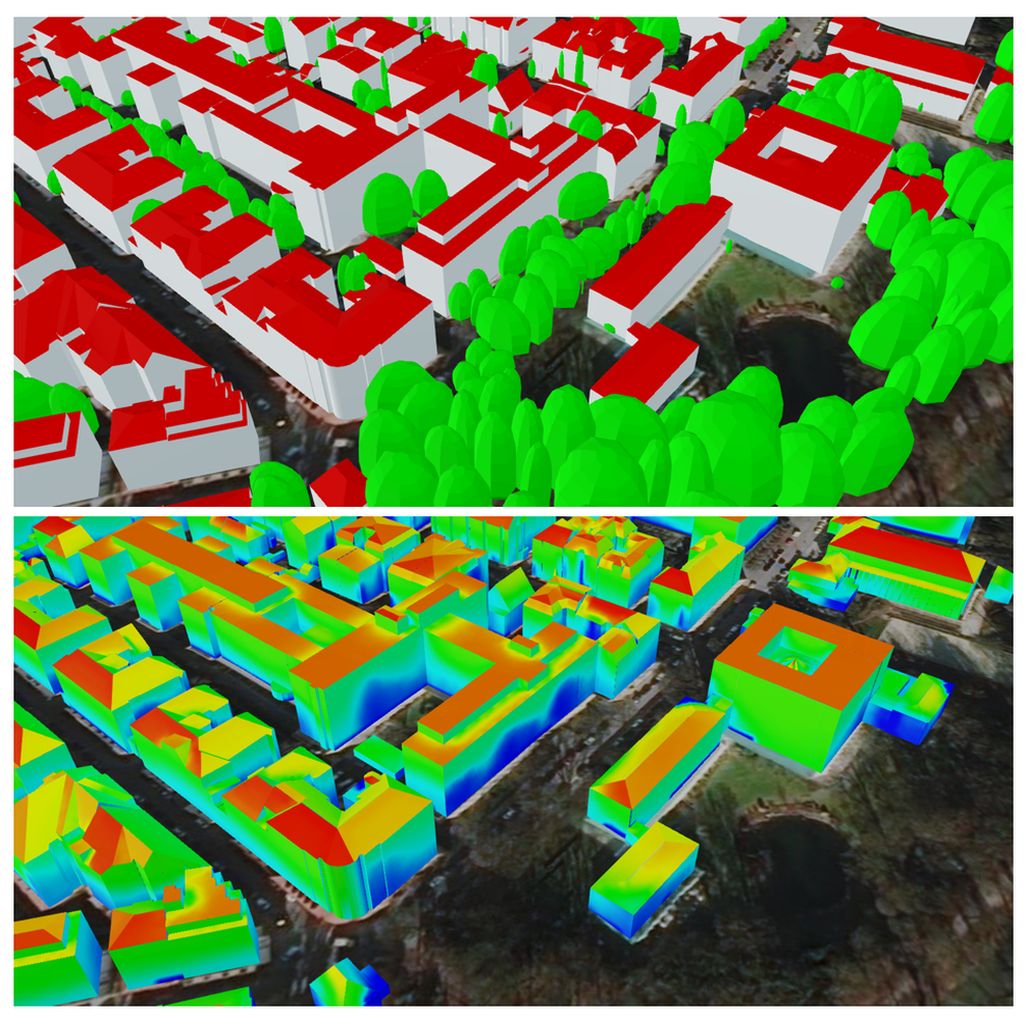 In enger Kooperation mit einem Team um Prof. Thomas H. Kolbe von der TU München haben die Forschenden des IÖR für alle Dach- und Fassadenflächen die solare Einstrahlung modelliert und visualisiert und so den möglichen solaren Energieertrag kleinräumig lokalisiert. Dafür hat das Team nicht nur auf detailliertere Gebäudemodelle mit ihren individuellen Dachformen zurückgegriffen. Auch die Umgebung der Gebäude, etwa Bäume und ihr Schattenwurf oder die Verschattung durch andere Gebäude sowie das Gelände und umgebende Berge wurden in die Berechnungen mit einbezogen.