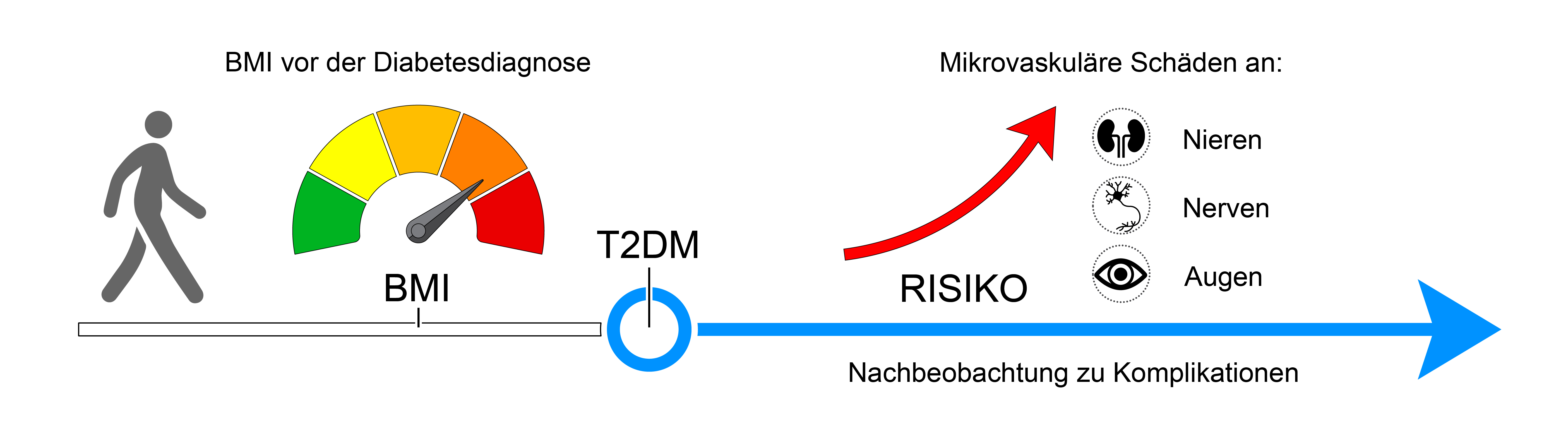 Das Gewicht spielt eine entscheidende Rolle für die Entstehung eines Typ-2-Diabetes. Ob und wie Fettleibigkeit und Gewichtsveränderungen zu Spätfolgen von Typ-2-Diabetes führen, ist jedoch wenig erforscht. Insbesondere Studien, die Vergleichsdaten zwischen mikro- und makrovaskulären Erkrankungen liefern, fehlen bisher. Mikrovaskuläre Komplikationen betreffen die kleinen Blutgefäße und können unheilbare Schäden in Nieren, Nerven und Augen verursachen, also zu Dialyse, Amputation und Blindheit führen. Makrovaskuläre Komplikationen wirken sich hingegen auf die großen Blutgefäße aus und begünstigen Herzinfarkt und Schlaganfall.