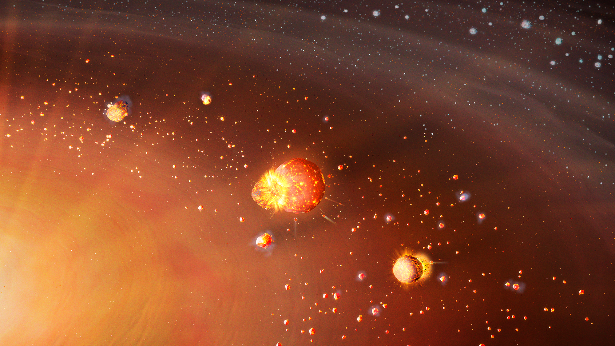 Numerische Experimente zeigten, dass sich diese Entstehungsprozesse durch zwei unterschiedli-che Phasen der Planetenentstehung erklären lassen. So ergaben jüngste Beobachtungen von protoplanetaren Scheiben um junge Sterne, dass diese relative geringe Turbulenz in ihrem Inne-ren aufweisen. Unter solchen Bedingungen können die im Gas eingebetteten Staubteilchen ef-fektiv zu deutlich grösseren Körnern anwachsen und so schon früh die ersten Planetenbausteine im inneren Sonnensystem bilden. Eine zweite Phase der effektiven Entstehung solcher Baustei-ne – Planetesimale genannt – erfolgte dann später weiter draussen im äusseren Sonnensystem.
