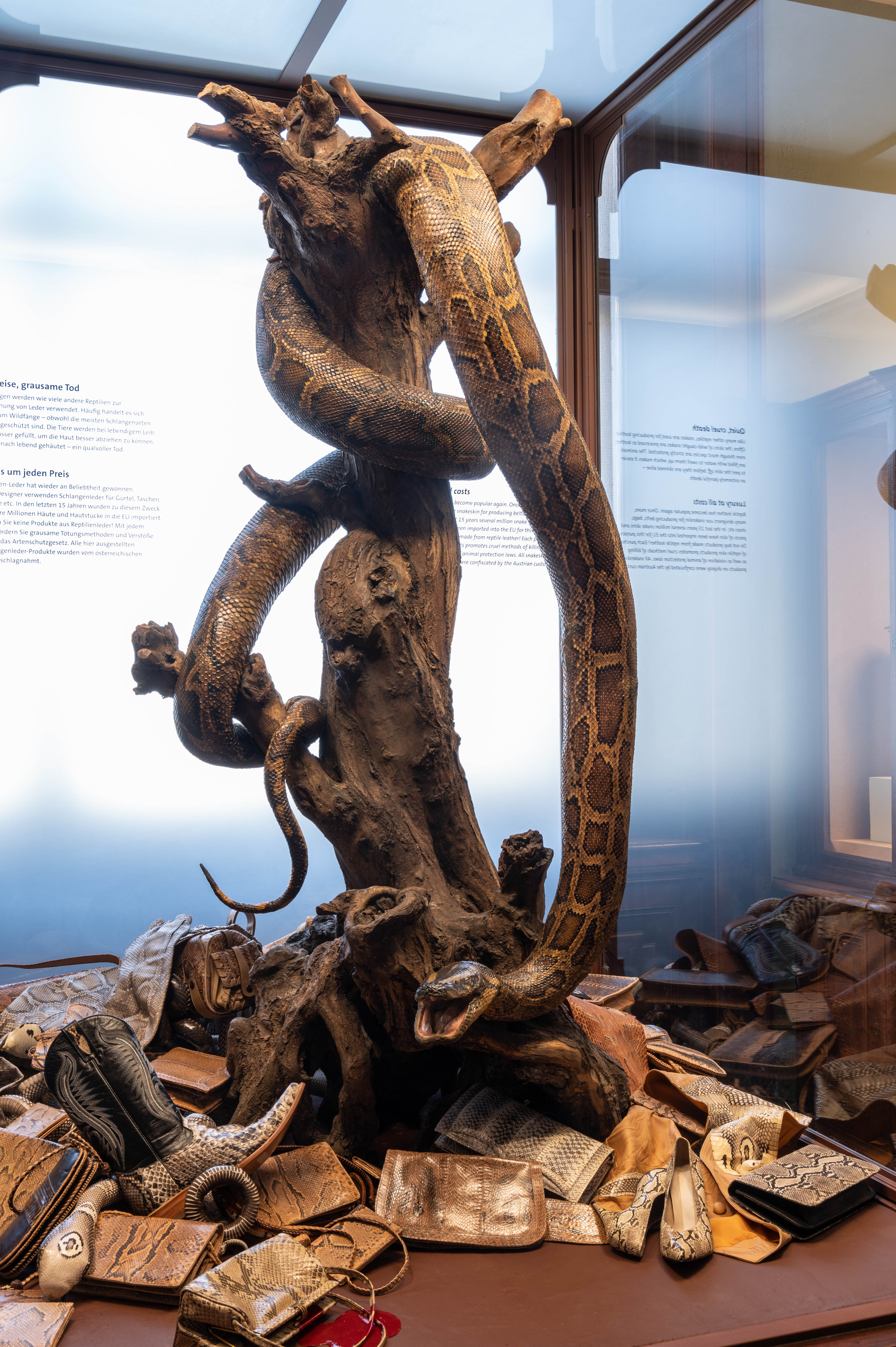 The newly designed display case has been on show in Hall 27 since mid-January 2021 and will be open to visitors after the end of the Covid-19 lockdown. The five-meter-long Burmese python from Java (Southeast Asia) has been part of the NHM Vienna collection since around 1900. In addition to this giant snake, the display also features countless products made of snakeskin such as stuffed cobras, wallets, trousers, shoes, and bags. Visitors are discouraged from buying products made from reptile skin – each purchase promotes cruel killing methods and violates the Endangered Species Act.
