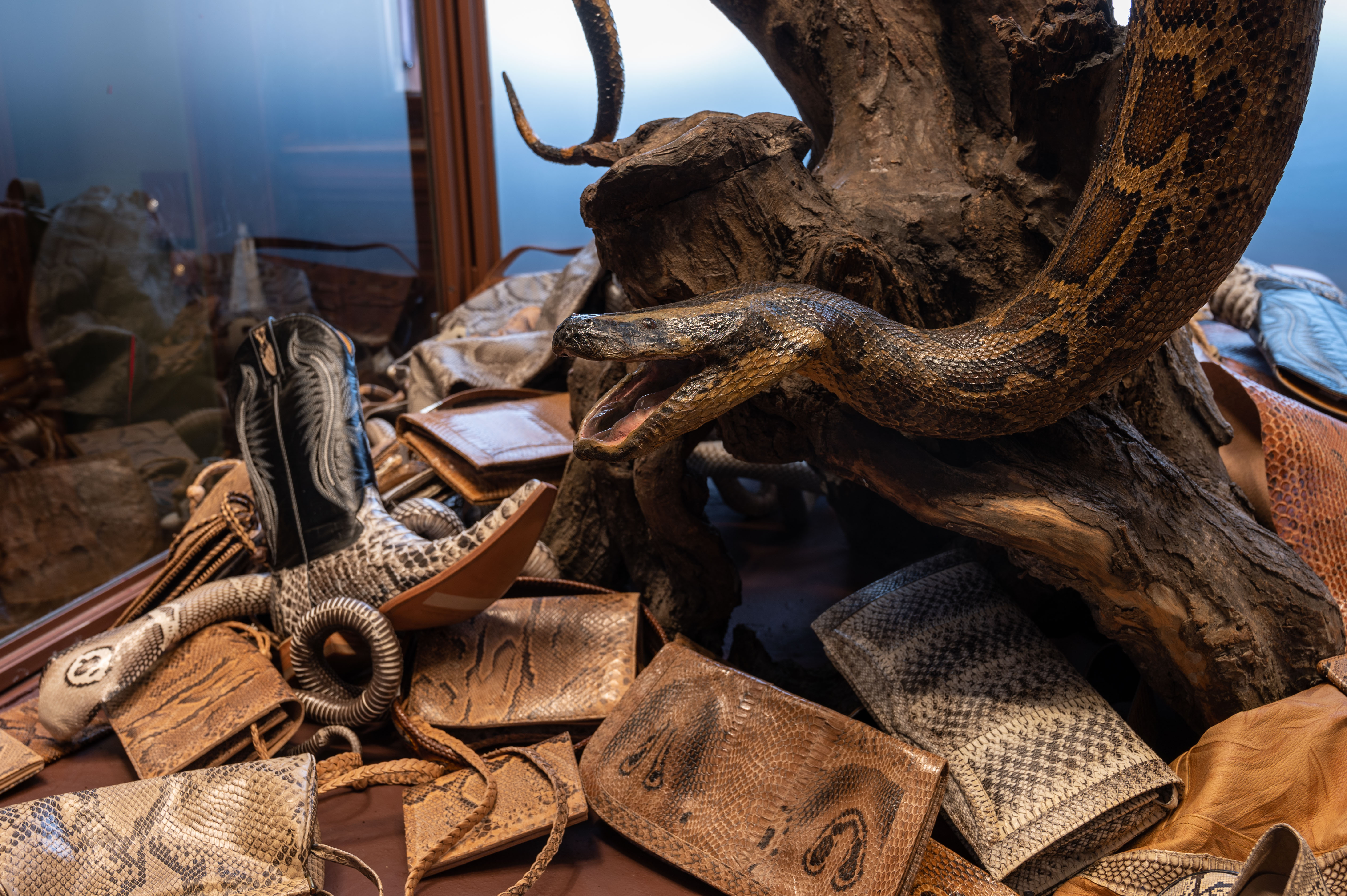 Alongside many snakeskin products on show in the display case visitors will also find a Burmese python (Python bivittatus). The commercial exploitation of the Burmese python for the leather industry has had a significant impact on population numbers in many Southeast Asian countries. Until the 1970s the Burmese python was a relatively common sight in Thailand, Laos, Cambodia, and Vietnam. In the years that followed, however, this species became increasingly popular for use in the leather industry. Trade restrictions imposed by Thailand to protect the Burmese python allowed the population to recover in some parts of the country by 2003, and the snakes were seen more frequently once again. Indonesia also awarded the Burmese python protected status in 1978. Since then, no export permits have been issued by Indonesia for the trade in Burmese python skins.