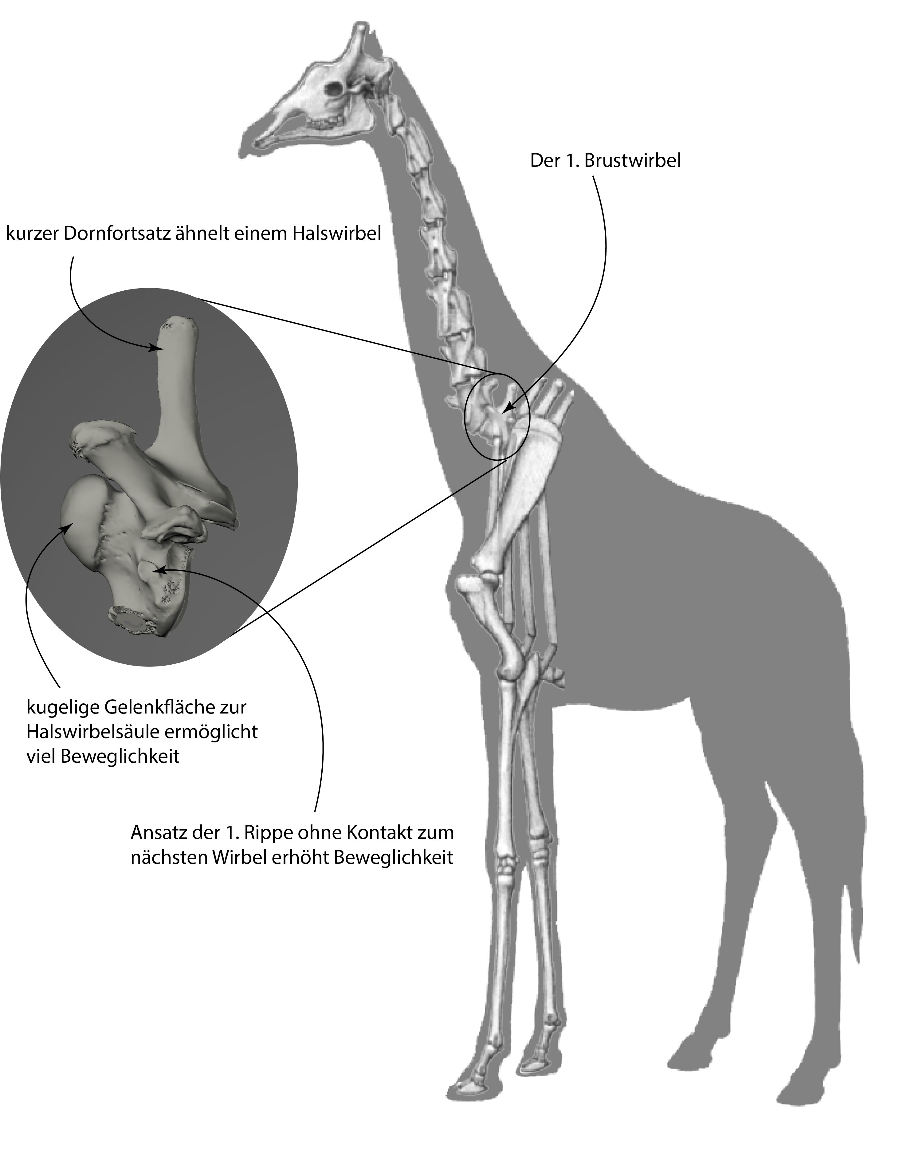 Marilena Müller (HU) unterzog die Knochen einer dreidimensionalen statistischen Gestaltanalyse. Die Gestalt des ersten Brustwirbels der Giraffe stach heraus und unterscheidet sich von anderen Paarhufern, die ebenfalls lange Hälse haben, wie beispielsweise bei der Giraffengazelle oder dem Vikunja. Obwohl der Knochen Rippen trägt und somit Teil der Brustwirbelsäule ist, ähnelt er in seiner Gestalt einem Halswirbel. In dieser Hinsicht ist die Giraffe einzigartig.