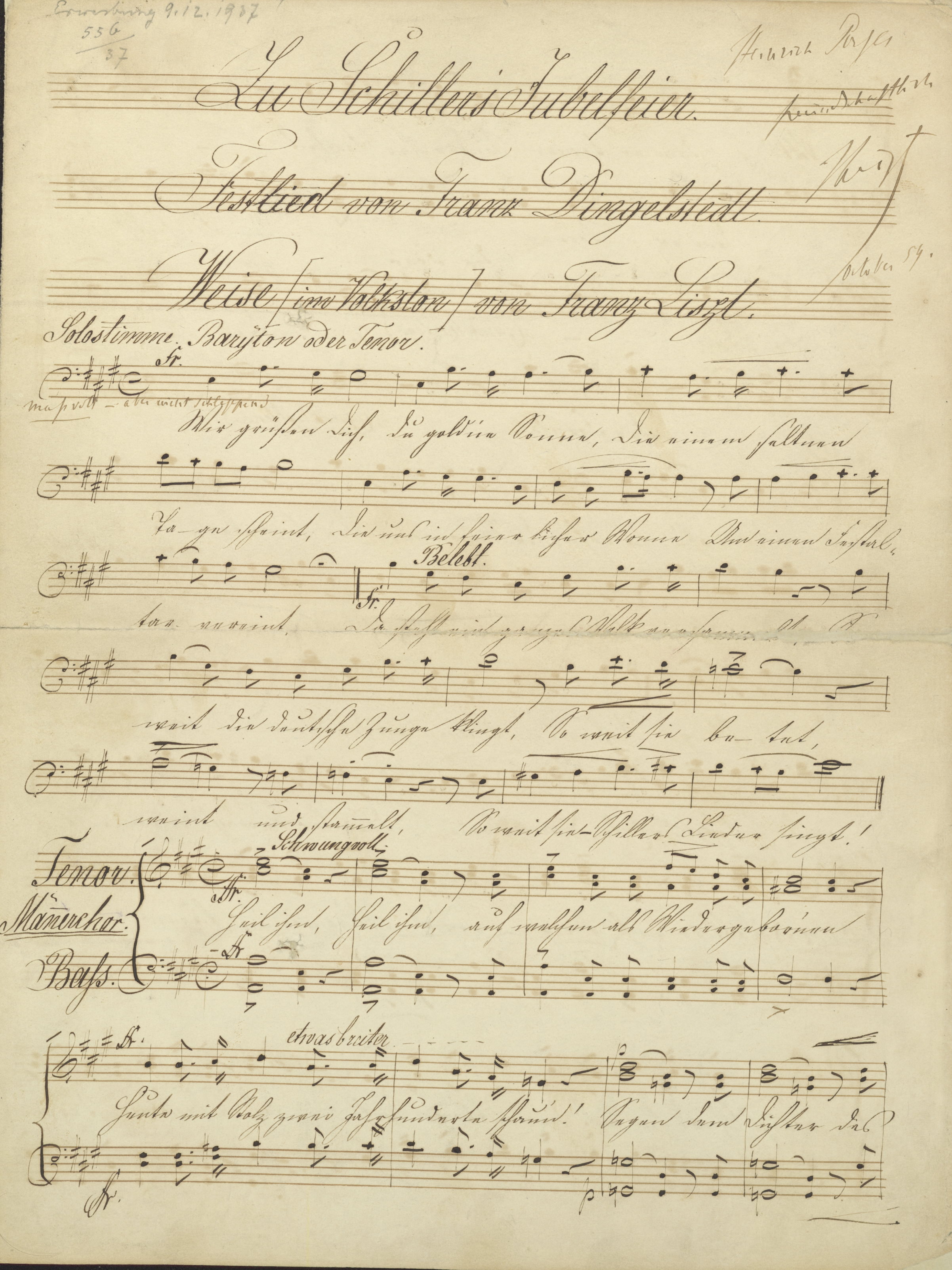 Bei den Notenmanuskripten handelt es sich zum einen um eine von Liszt umfassend überarbeitete Partiturabschrift seines 1. Klavierkonzertes Es-Dur. Sie gilt als letztgültige Kompositionsfassung und diente dem Erstdruck (Wien, Haslinger 1857) als Stichvorlage. Das zweite Manuskript − eine Abschrift des „Festliedes zu Schillers Jubelfeier“ − enthält eine eigenhändige Widmung Liszts.