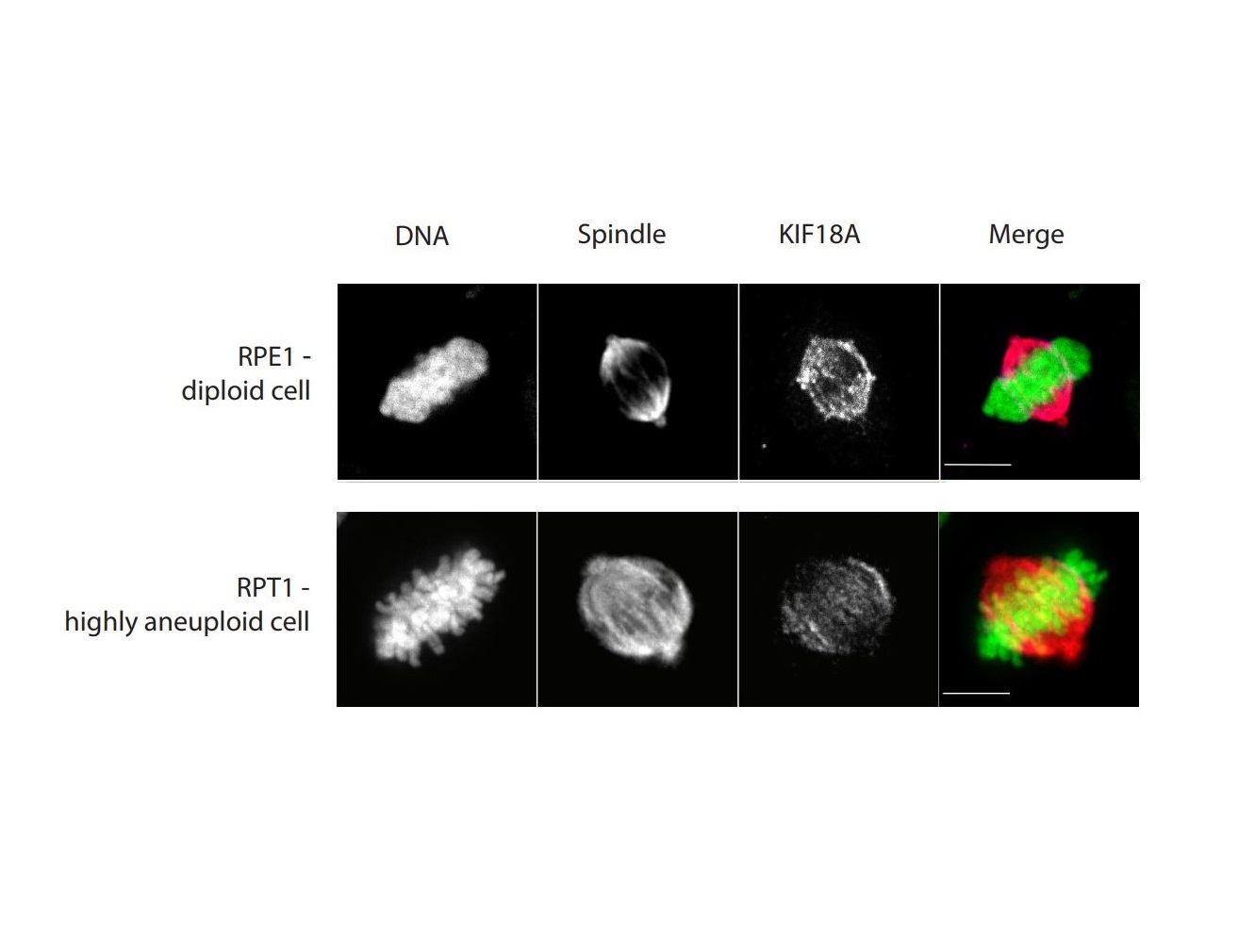 KIF18A ist ein Kinesin-Motorprotein, das an die mitotische Spindel bindet und diese reguliert; eine molekulare Struktur, die eine korrekte Chromosomenteilung ermöglicht. Die Forscher wissen noch nicht genau, was KIF18A in aneuploiden Zellen anders macht als in normalen Zellen, aber sie vermuten, dass es der sich teilenden Zelle irgendwie hilft, die abnorm hohe Anzahl von Chromosomen physikalisch unterzubringen. Durch Bildgebung von lebenden Zellen sehen sie, dass die mitotische Spindel in den aneuploiden Zellen eine andere Form hat als in normalen Zellen. Dies wird ein Ansatzpunkt für weitere Forschungen sein.