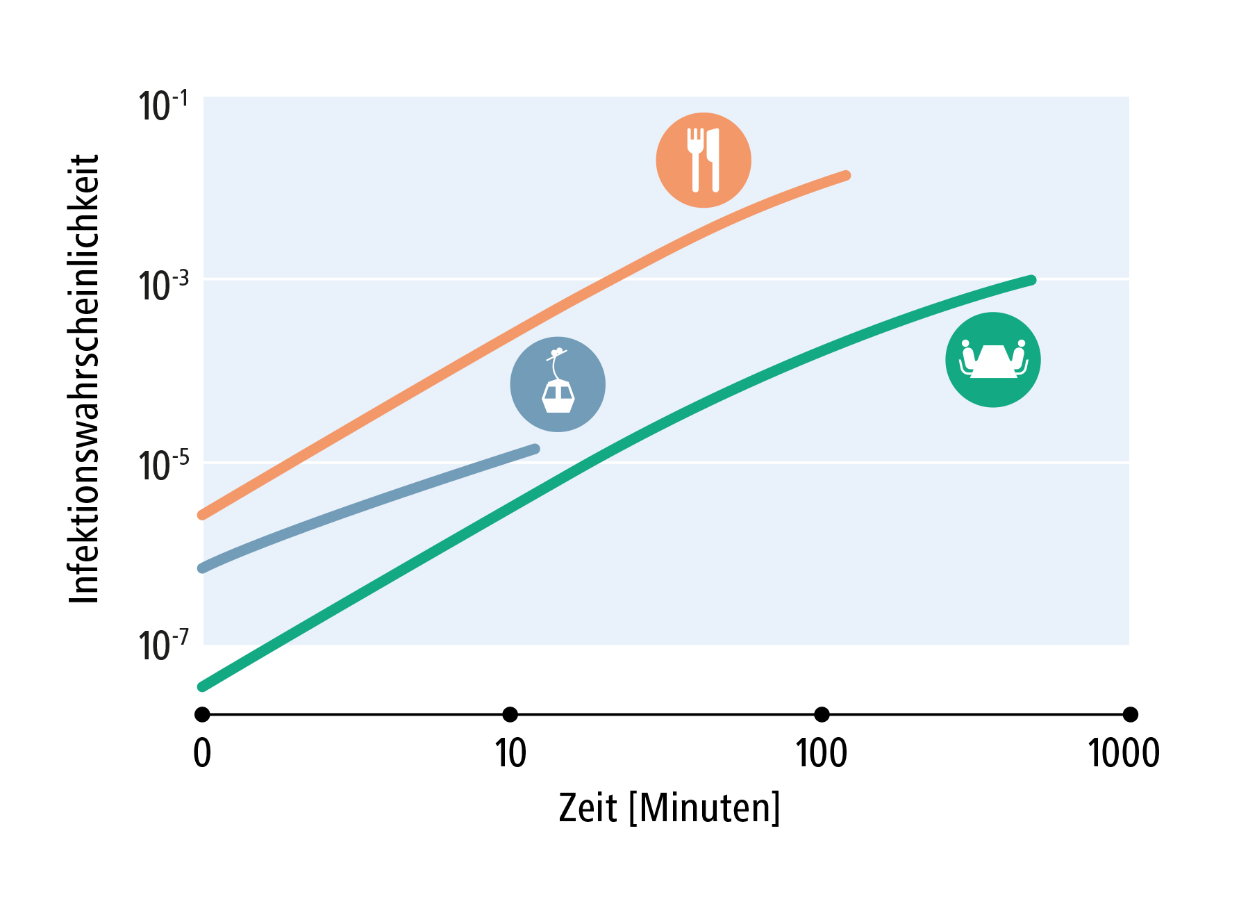 Mit diesen und anderen Faktoren wie etwa der Zeitspanne, in der Erreger inaktiv werden, errechneten die Forscher zunächst Infektionsrisiken für anfällige Personen in der Kabine – und daraus schliesslich ein Risiko für sämtliche Passagiere. Wichtigste Parameter sind die Luftaustauschrate, die Anzahl Infizierte pro Luftvolumen und die gesamte Verweildauer. Die Resultate für eine kleinere Seilbahnkabine (acht Personen, offene Fenster) veranschaulicht ein Vergleich mit anderen Orten: Ein Dinner-Event auf 30 Quadratmetern mit acht Menschen, die sich laut unterhalten, wäre massiv riskanter. Das Infektionsrisiko einer 12-minütigen Fahrt mit der kleineren Kabine ist zudem deutlich geringer als bei einem 8-stündigen Arbeitstag in einem Zweierbüro mit 20 Quadratmetern Fläche, dessen «Luftfüllung» einmal pro Stunde ersetzt wird. Wenn die Fenster also offenbleiben, bedeutet ein Skitag mit einigen Kabinenfahrten ein deutlich geringeres Ansteckungsrisiko als ein Arbeitstag in einem wenig belüfteten Zweierbüro.