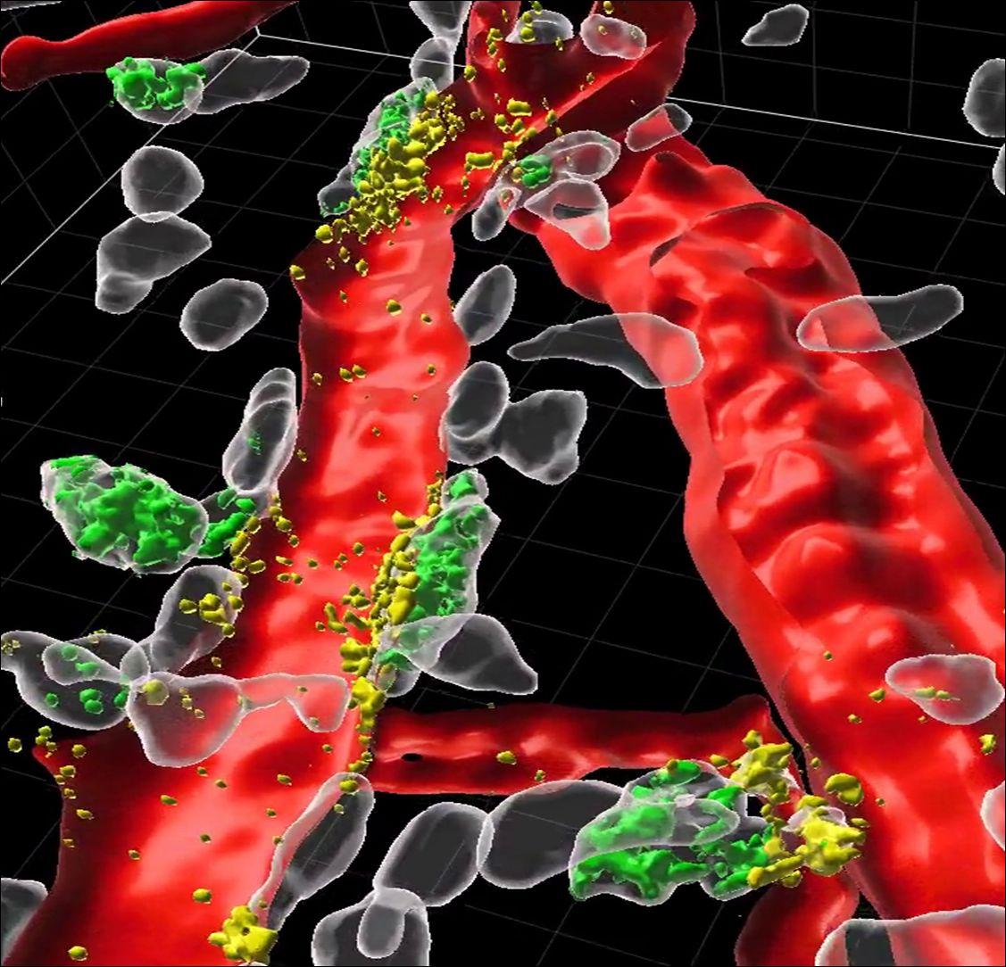 Aber wie gelangt nun das TNF der Mastzellen im Gewebe zu den Neutrophilen im Blutgefäß? Die Magdeburger Forscher*innen konnten mit Hilfe hochauflösender 2-Photonen-Mikroskopie in faszinierenden Aufnahmen zeigen, dass die Mastzellen hierzu einen verblüffenden Trick nutzen. Sie positionieren sich wie Torwächter direkt rund um das Blutgefäß herum, und schieben dabei kleine Fortsätze sogar in das Blutgefäß hinein. Und aus diesen Fortsätzen werden im Alarmfall die Granula freigesetzt, die auch TNF enthalten. Dadurch gelangt es sofort dahin, wo die Neutrophilen es „sehen“ können, nämlich in das Innere der Gefäße, direkt in das Blut. Das freigesetzte TNF sorgt dafür, dass Oberflächenproteine auf den Neutrophilen aktiviert werden. Die im Blutstrom zirkulierenden Zellen werden dadurch gewissermaßen klebrig und können sich an der Gefäßwand anheften und dann ins Gewebe einwandern.