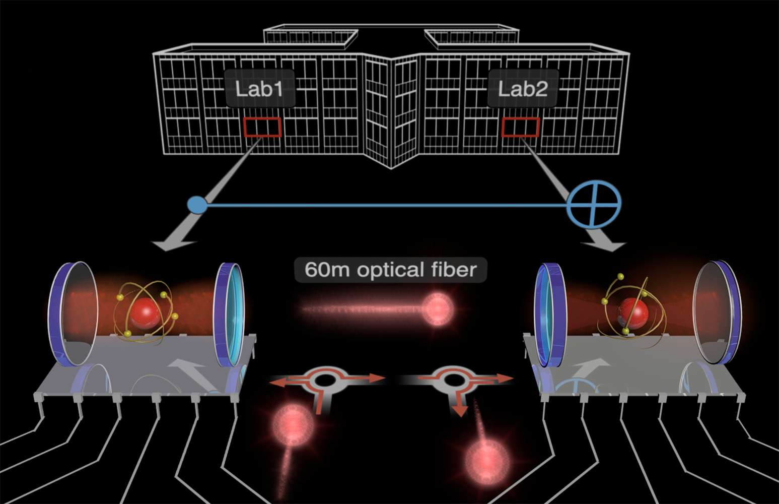 Image Caption: This picture shows the two qubit modules (red atom between two blue mirrors) that have been interconnected to implement a basic quantum computation (depicted as light blue symbol) over a distance of 60 meters. The modules reside in different laboratories of the same building and are connected by an optical fiber. The computation operation is mediated by a single photon (flying red sphere) that interacts successively with the two modules. (Figure by Stephan Welte/Severin Daiss, MPQ)