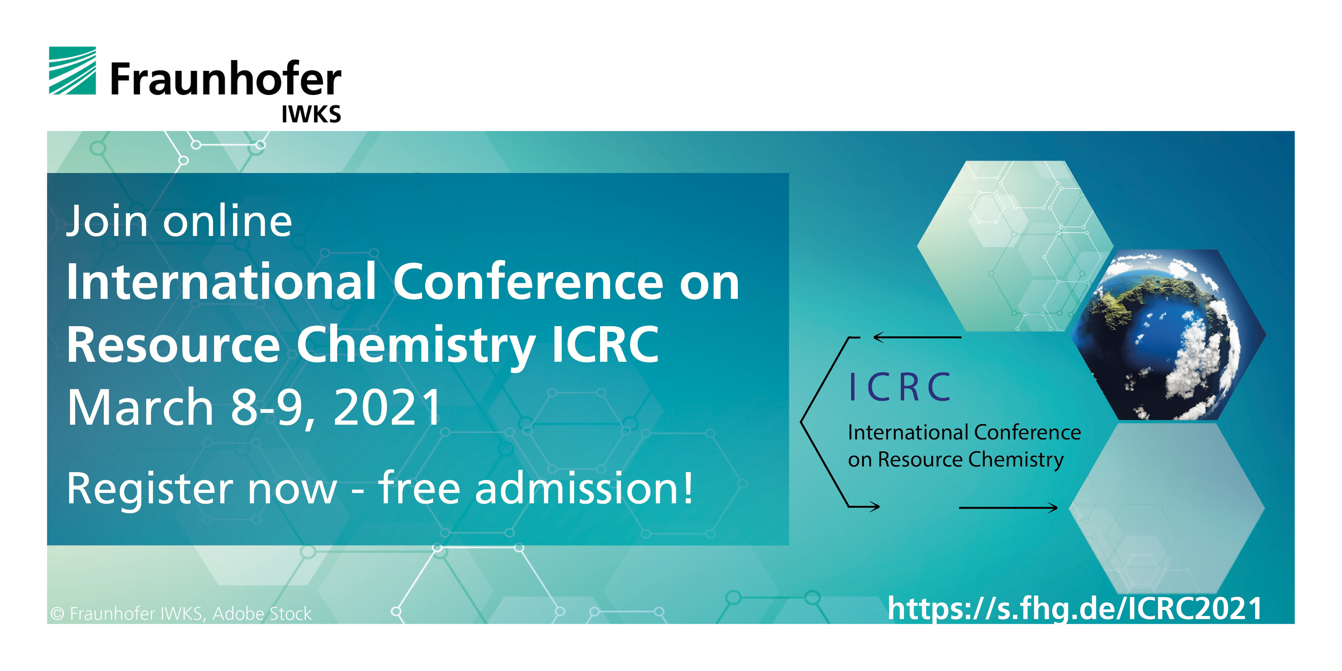 In times of increasing pressure on business and politics with regard to environmental protection and resource efficiency, science and research are called upon to make their contribution and jointly find answers to some of the world's most challenging technological tasks. The conference »International Conference on Resource Chemistry - ICRC«, originally planned for 2020, has been postponed to March 8-9, 2021, due to the Corona pandemic. The event concept has been changed to a purely digital format to enable speakers and participants to network even in times of Corona. In addition, participation will be completely free of charge - registration will take place online via the conference website.
