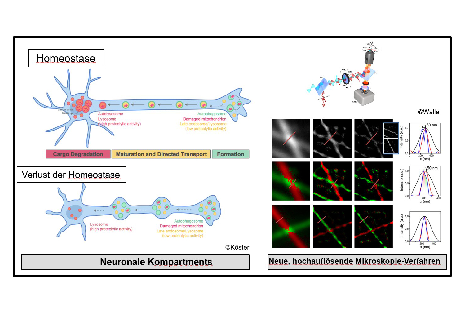 Um solche Prozesse in lebenden Nervenzellen beobachten zu können, fehlen bisher präzise Messinstrumente. Die will das Forschungsteam jetzt in dem interdisziplinären Projekt entwickeln. Dafür arbeiten Forschende aus der Neurobiologie, der Systembiologie, der Chemie und den Ingenieurswissenschaften wie Maschinenbau und Elektrotechnik zusammen. Unter anderem soll eine neuartige Durchflusskammer gepaart mit winzigen Nano-LED-Modulen entstehen, die es ermöglicht, lebende Nervenzellen über einen längeren Zeitraum zu untersuchen. Mithilfe der Durchflusskammer soll präzise reguliert werden, mit welchen Substanzen oder Krankheitserregern einzelne Kompartimente von Nervenzellen in Kontakt kommen. Die Nano-LED-Module fungieren dabei als kleine Mikroskope und erlauben eine dauerhafte Beobachtung. So kann beispielsweise über mehrere Wochen beobachtet werden, wie Nervenzellen und ihre Kompartimente sich aufgrund der Einwirkung von Viren oder Bakterien verändern oder welche langfristigen Auswirkungen Wirkstoffe auf Nervenzellen haben.